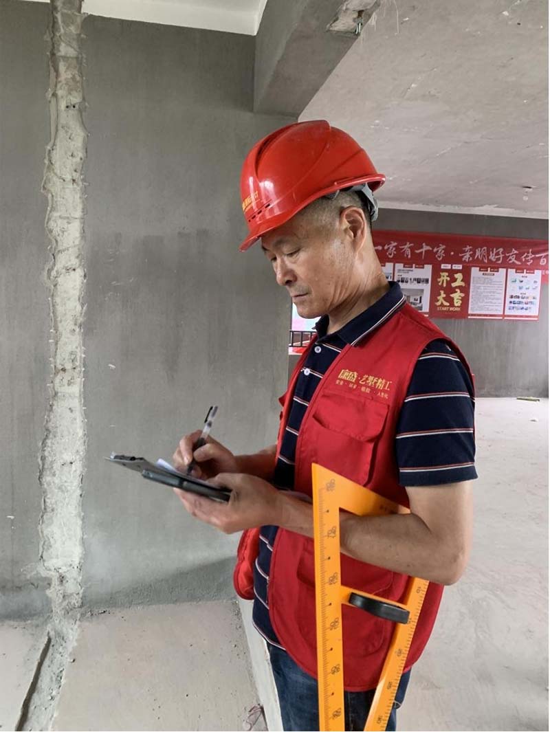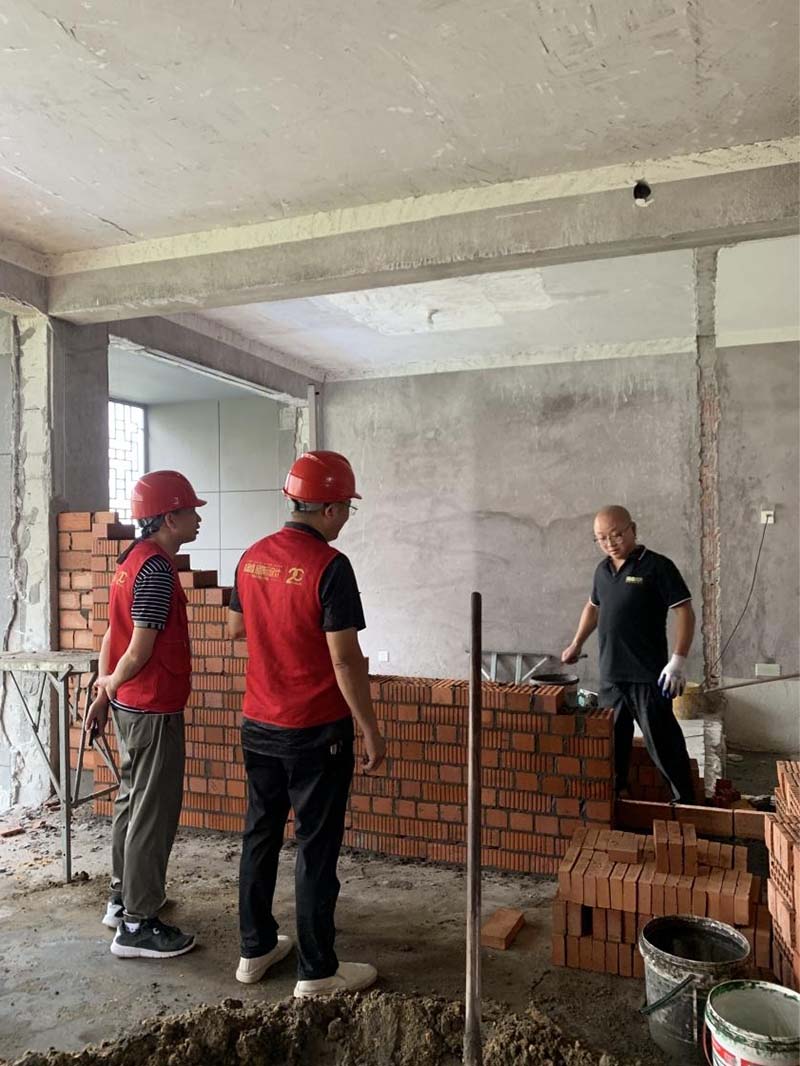 ▲檢查新砌墻面的平整度