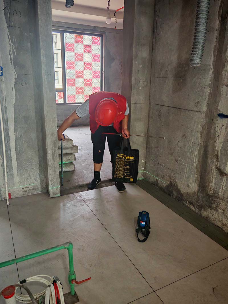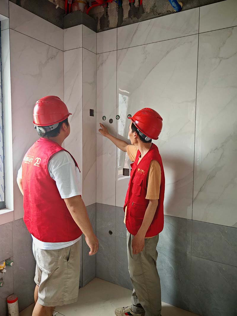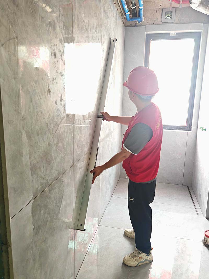 ▲檢查墻面磚平整度