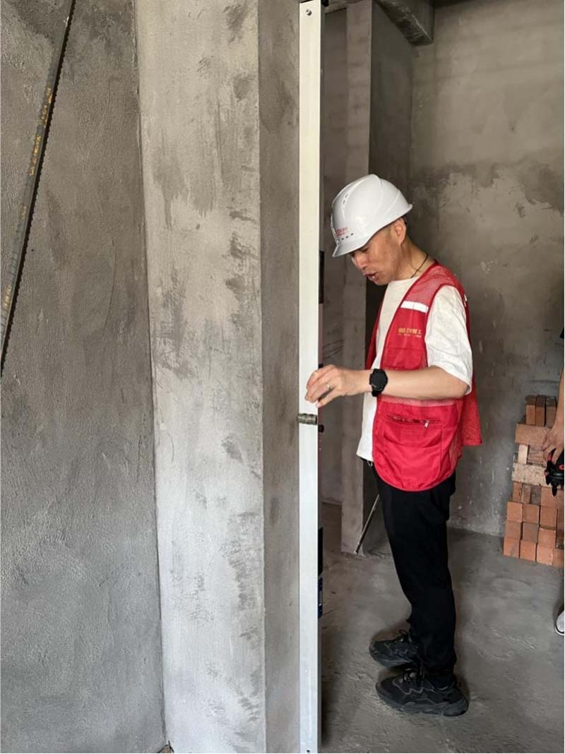 ▲檢查新砌墻面的平整度