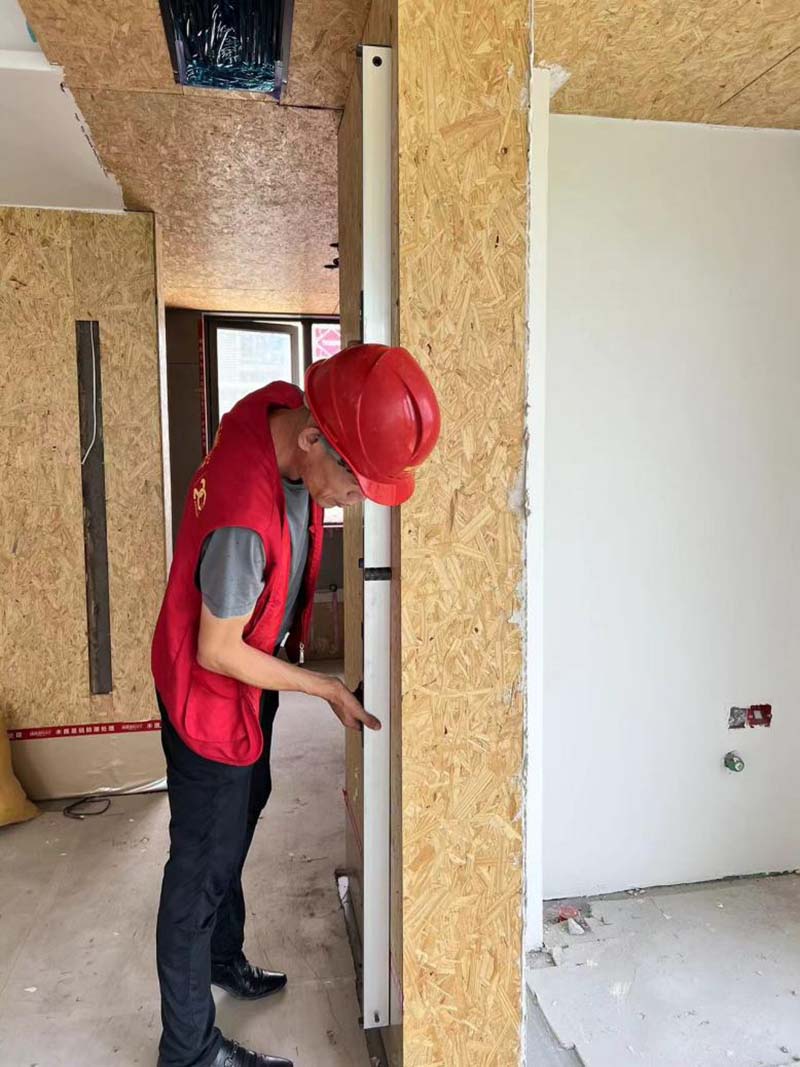 ▲檢查歐松板墻面的垂直度