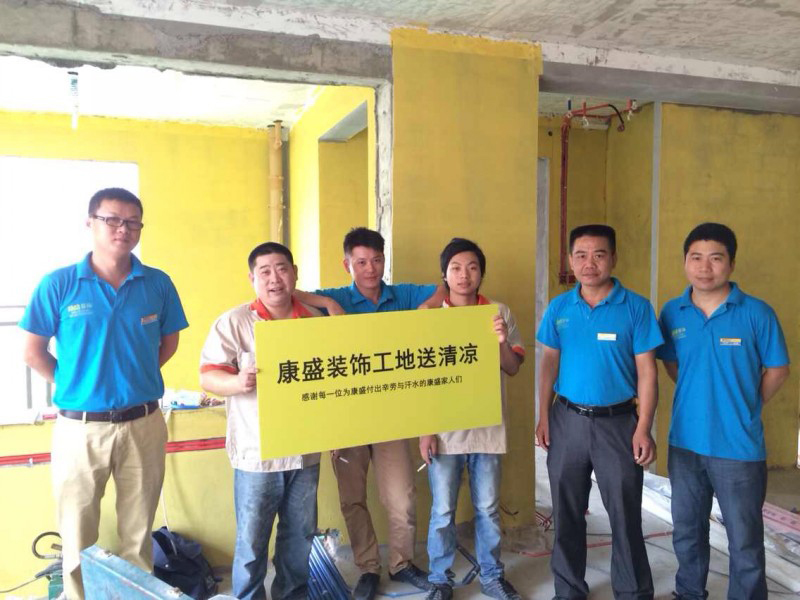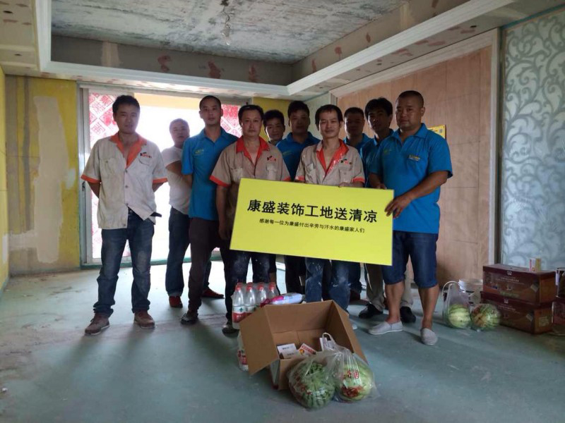 最近,由于氣溫不斷升高,在我們只愿意待在空調(diào)間里面的時候,但我們一出門就大汗淋漓的時候,我們的施工工班還在一線為我們的業(yè)主裝修新家!我們表示我們康盛家人對他們的關(guān)心,我們特別組建了“康盛裝飾工地送清涼”活動,把礦泉水、毛巾、肥皂、清涼油、西瓜霜含片等消暑降溫的物品一一送到我們工班手中,希望他們在認真施工的同時,也要注意自己的身體!