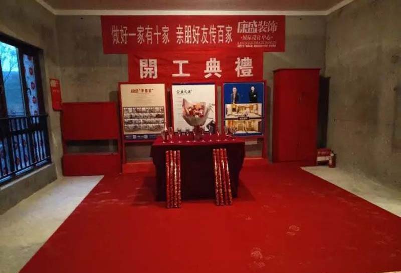 1.前期準(zhǔn)備:「康盛紅」是開(kāi)工儀式前的物料準(zhǔn)備,包括香檳、香檳杯、鮮花、禮炮、開(kāi)工錘、紅桌布、紅地毯、工具箱、滅火器、文件袋、形象展板、兩條橫幅。