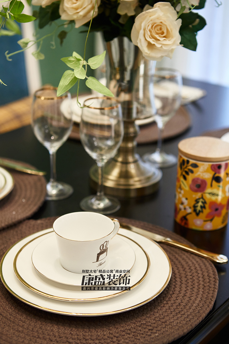 餐廳白綠相間,深木色的餐桌上,置以精巧餐具,配飾一瓶鮮花。