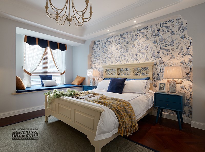 次臥以藍白色系的花鳥墻紙作為背景墻,無疑是本房間的亮點。