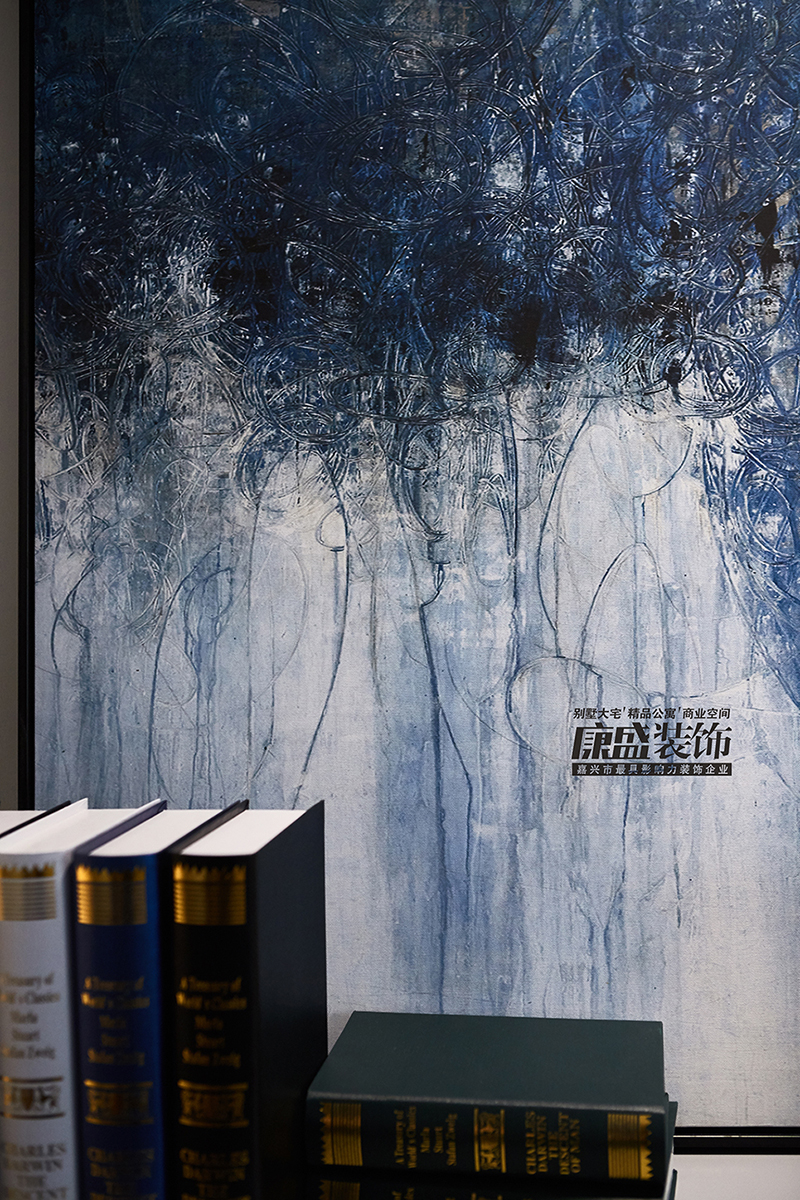 深咖色的書桌,整排書架,以一種沉穩(wěn)的質感、色系的差距,與客廳無聲分區(qū)。