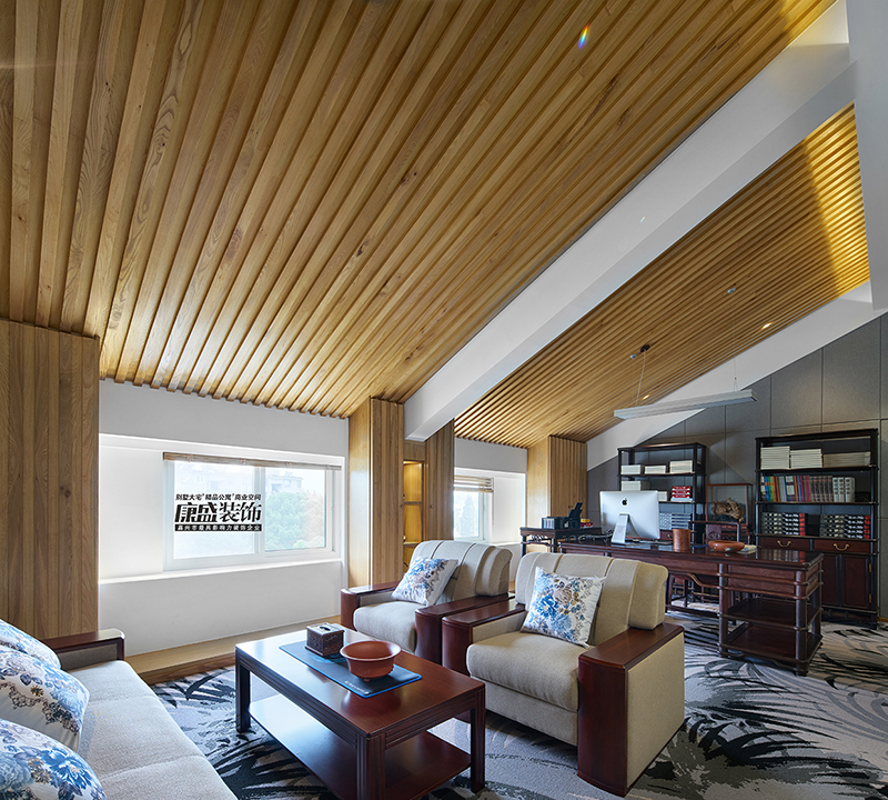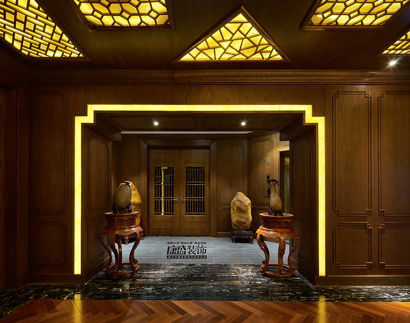 四層是業(yè)主的辦公坐議空間,利用挑高的原始空間,長(zhǎng)過道做了一個(gè)假梁中式原木頂,配合柔和的燈光處理,盡顯空間的意境!