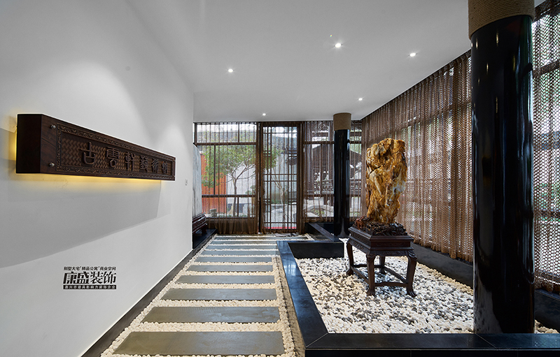 三層為書畫展示區(qū),整個(gè)空間采用了東方瓦頂為背景主基調(diào),配以枯山水做地面映襯,一副副名家之作突顯使整個(gè)空間獨(dú)具畫面感!