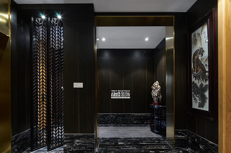 一層是業(yè)主的接待中心,一進(jìn)門采用了中式的雕花頂做為主題,配合墻面的毛石,一條外廳引入的水景,把整個(gè)空間帶入到東方禪意的意境之中!