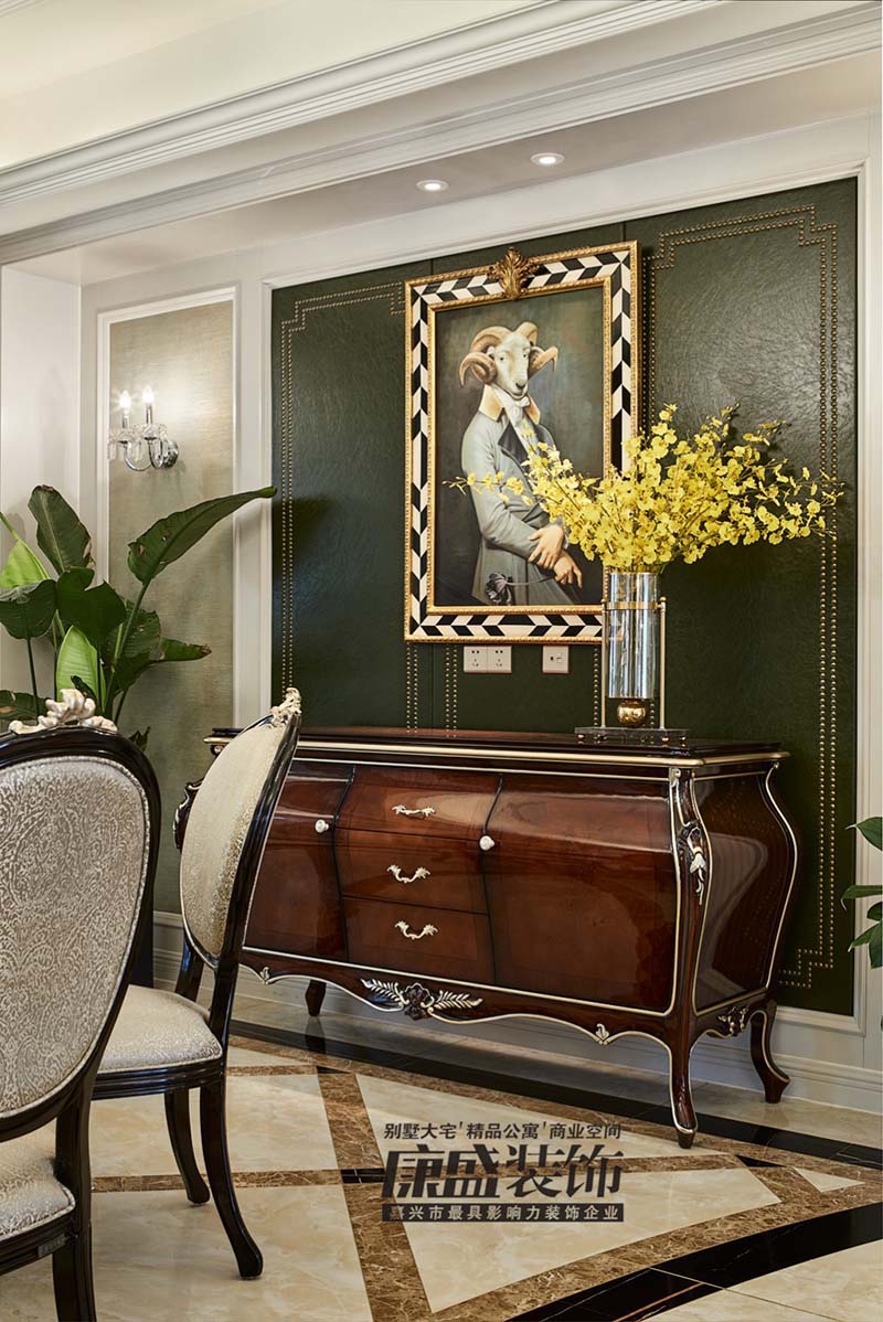 設(shè)計(jì)墨綠色的背景墻來(lái)深化氛圍,