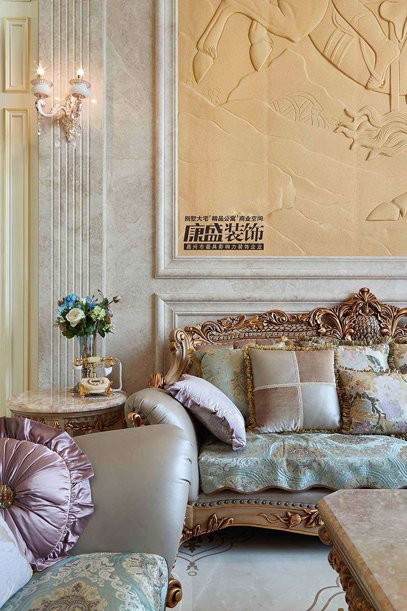 入眼即為方正大氣結構的客廳,無不凸顯氣宇軒昂的華麗氣息,隨處可見的高貴金色系點綴都是身份的象征。置身此處空間,可以感受主人與身俱來的浪漫和典雅。