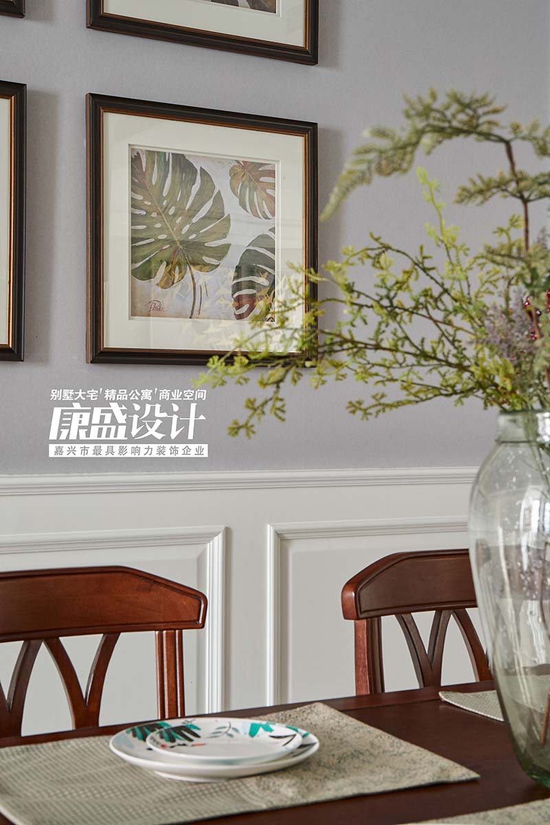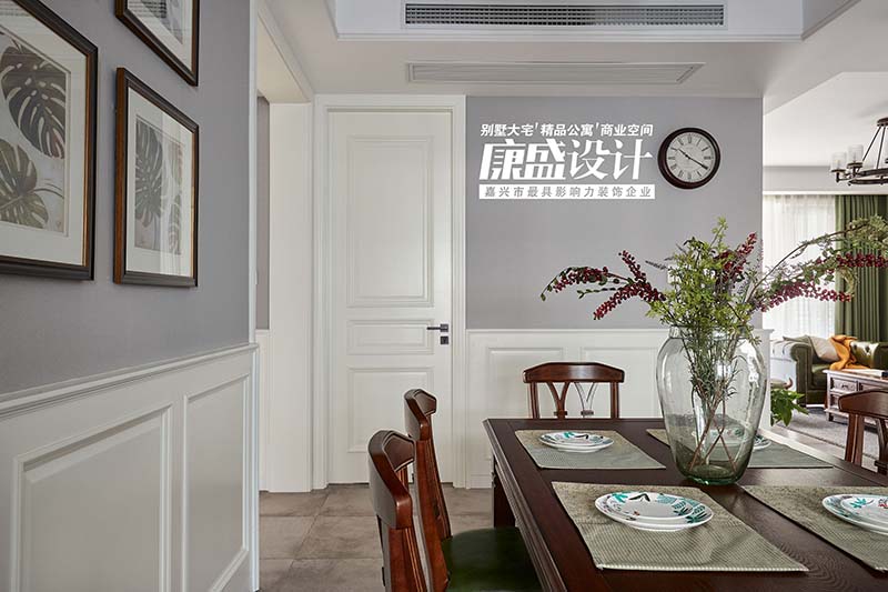 客廳、餐廳大面用的是白色護墻和融合度極高的灰色墻紙,而后大膽地用了濃重的家具去增添空間的層次感。
