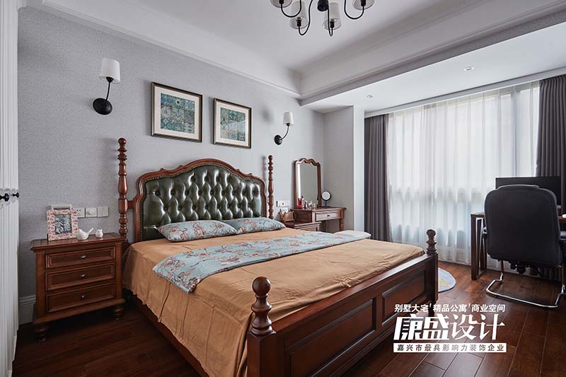 主臥沿襲了客廳和餐廳的優(yōu)雅,用了不一樣的灰調墻紙配以重墨的家具。
