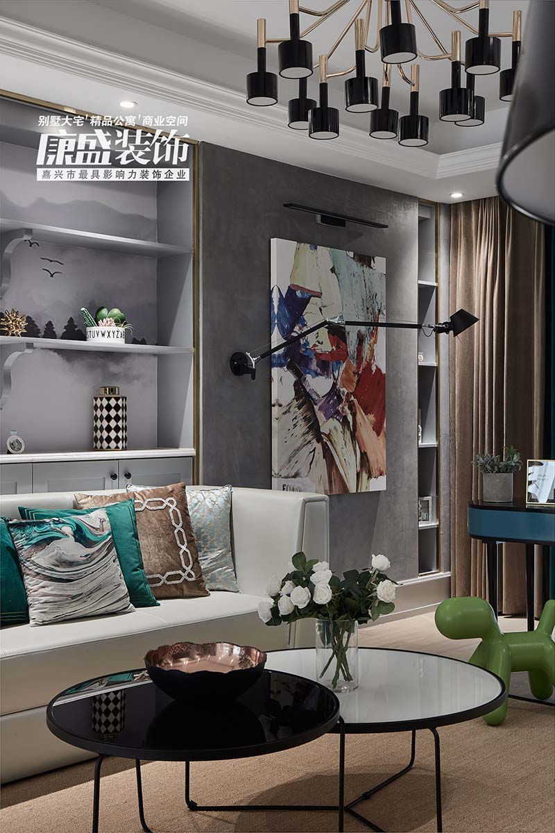 灰色的藝術(shù)漆墻面,在射燈的襯托下更顯大氣。銀色沙發(fā)、大面積的山水風(fēng)景圖、抽象彩色掛畫形成巨大沖擊力??兹妇G的座椅與抱枕相互輝映,給整體色調(diào)增加了一抹亮色。簡約而富有藝術(shù)氣息,一種凌駕于繁華之上的凝練之美,落落大方又不失獨(dú)特。