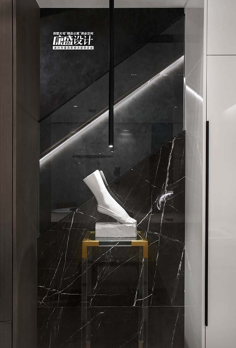 它的飾品很少,沒有堆砌的感覺,所以對(duì)僅有的裝飾物十分挑剔,體量感、價(jià)值感和意識(shí)形態(tài)均要有較高的氣場(chǎng)和審美度。并有眾多隱喻性的視覺符號(hào)在作品中,也更加強(qiáng)調(diào)以業(yè)主為本的設(shè)計(jì),可以看到家中的許多裝飾畫采用業(yè)主一家的生活照,強(qiáng)調(diào)這并不是單純的一個(gè)漂亮房子,把業(yè)主的生活和家融入進(jìn)去。