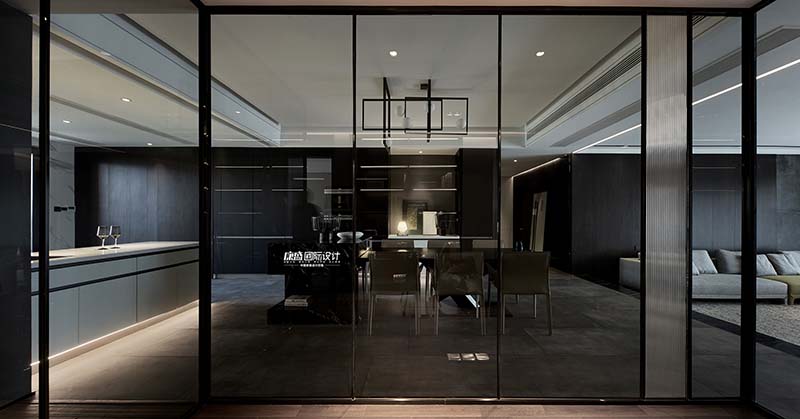 相信大部分朋友會被玻璃面隔斷吸引,這也是本案的亮點之一。設(shè)計目的是把原有過大的餐廳空間借用一部分給書房,以作延伸。