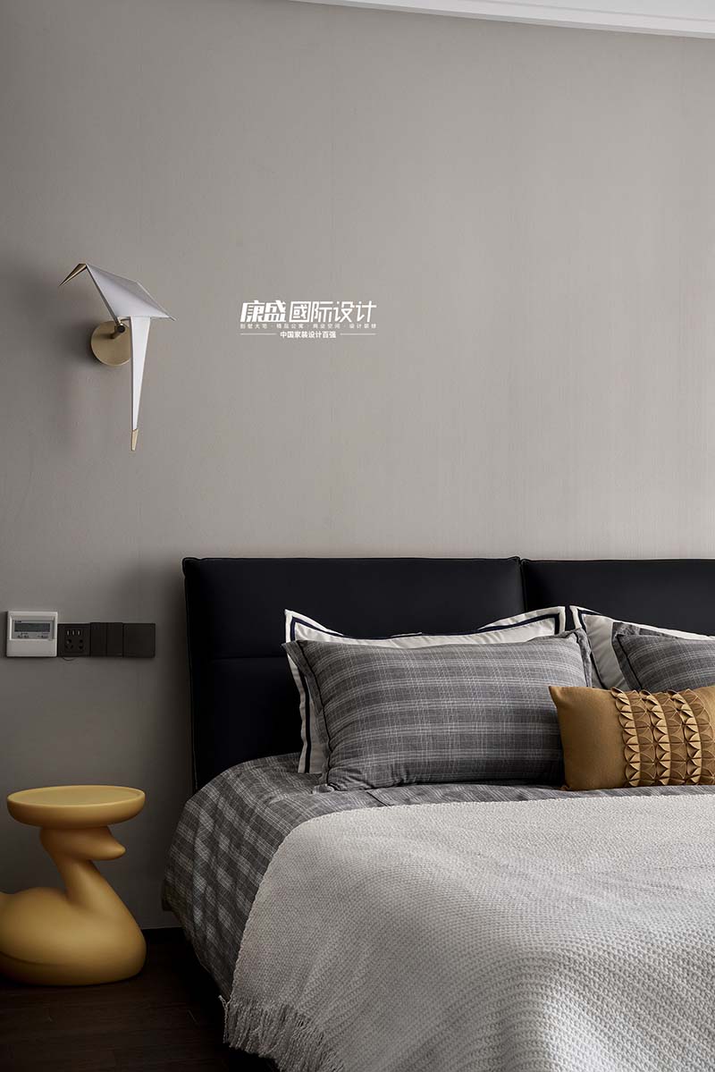 書房的左手邊是主臥,這是一個整體的大套間,寬敞的臥室和單獨的大衣帽間。打開主臥門的同時,相信你一定會被整面黑色但有肌理感的墻面所震撼,底口木飾面的抬高以及線性燈帶和墻面形成一個強(qiáng)烈的視覺,盡顯高級。