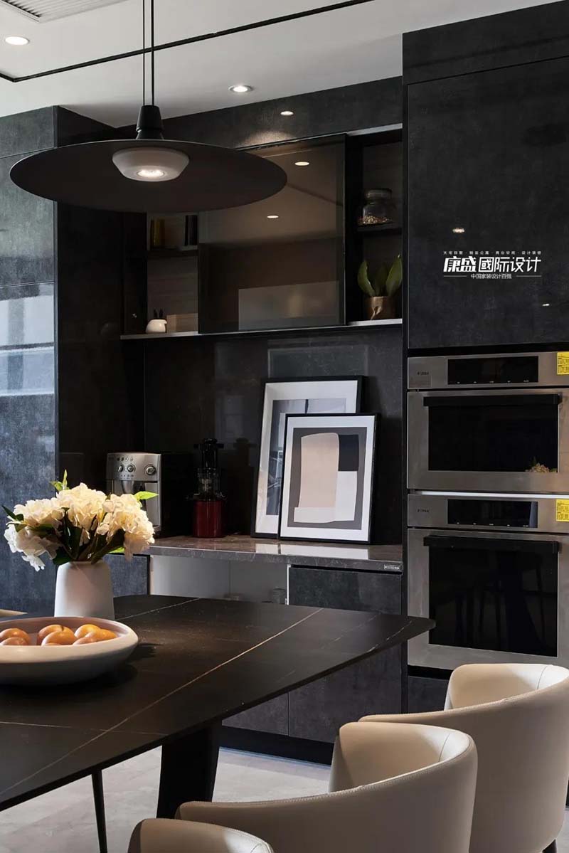 敞開(kāi)式廚房旁邊一席長(zhǎng)桌圍攏了用餐氛圍,從餐桌到吧臺(tái)到廚房,各種柜體的材質(zhì)延伸感,形成一個(gè)寬敞的空間協(xié)調(diào)感。