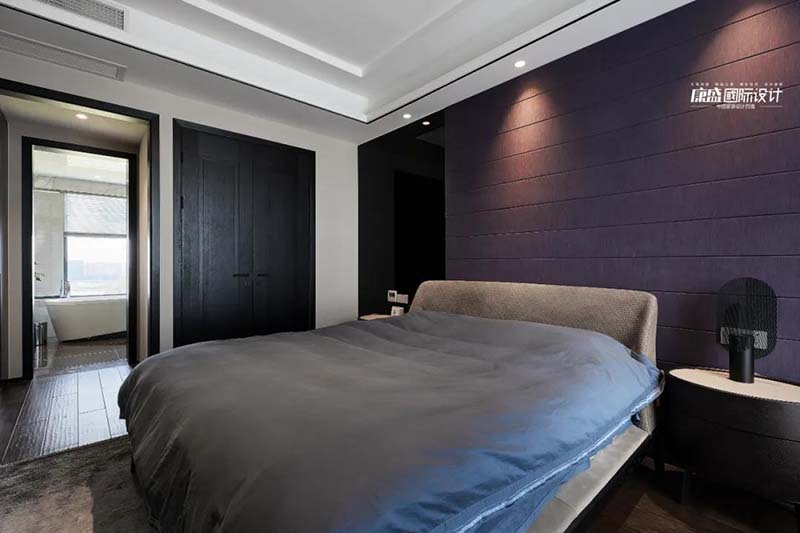 進(jìn)入休閑室就屬于主人的套房空間,圍繞主人生活形式展開(kāi),看書(shū)、辦公、觀影、游戲、休息集于一體,簡(jiǎn)約的主臥床背景透出潮流的設(shè)計(jì)語(yǔ)言,又不失細(xì)節(jié),橫向條達(dá)的硬包與黑色玻璃墻,形成材質(zhì)的軟硬對(duì)比
