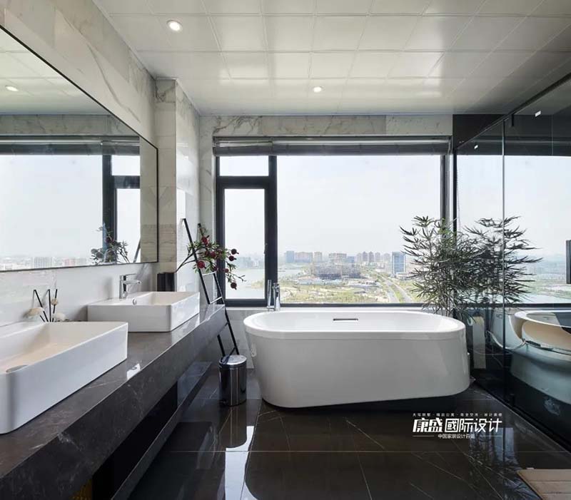 超大衛(wèi)生間以黑白為基色,凸出墻體的洗手臺(tái)上,亦有花草盎然,遠(yuǎn)望室外是公園的美景,獨(dú)立浴缸沐浴時(shí)出神發(fā)呆,放松思緒。