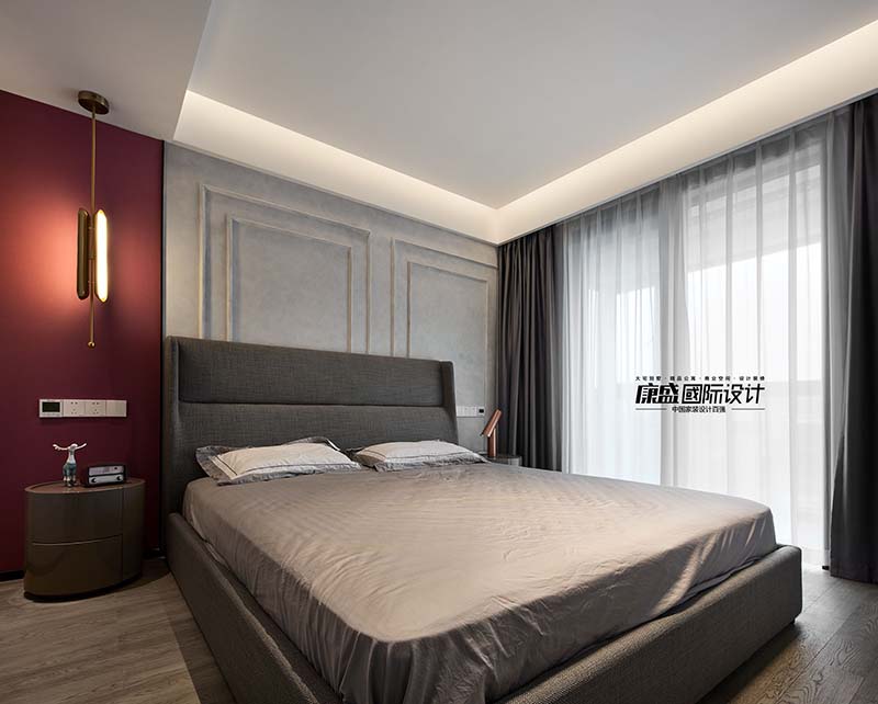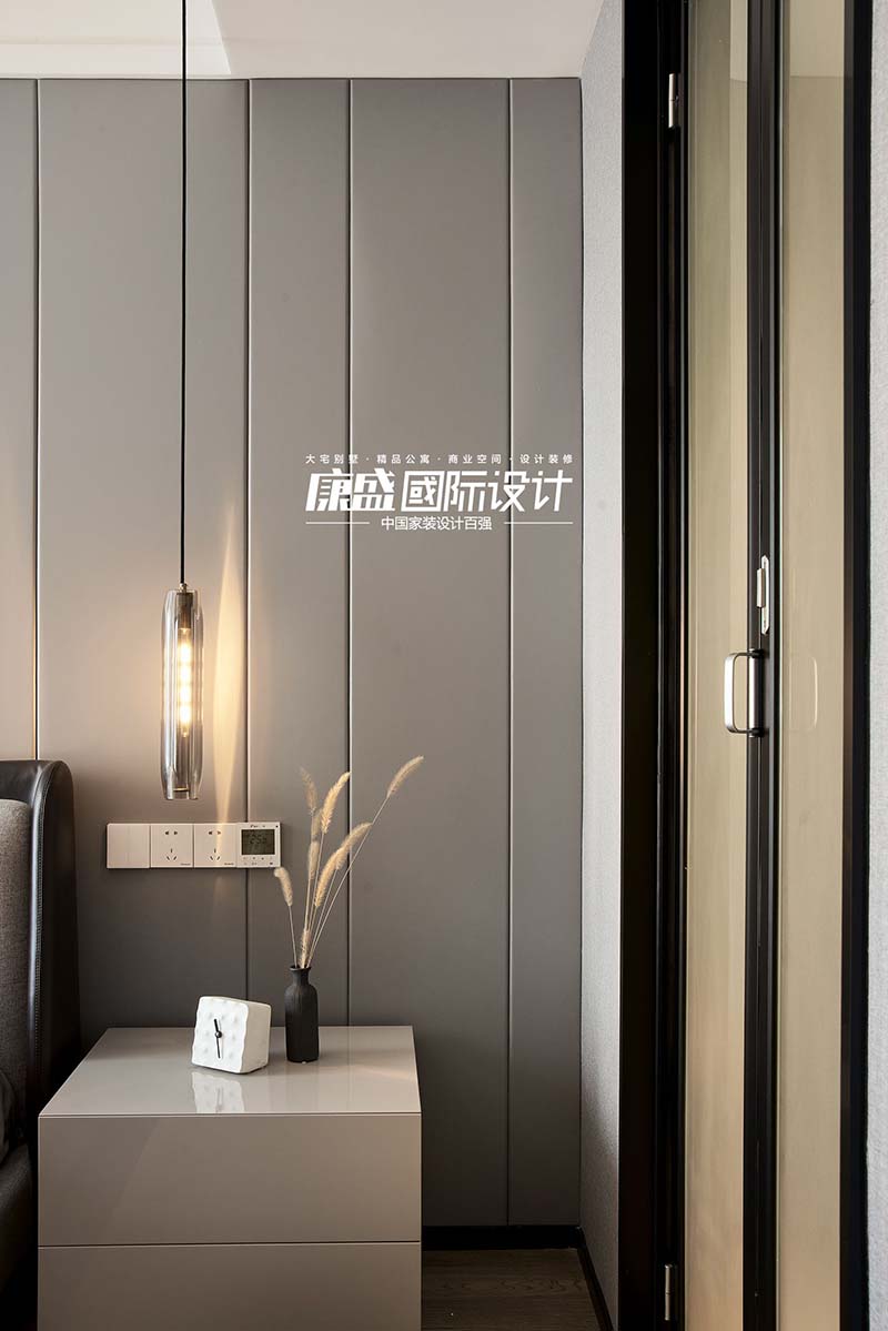 主臥以灰色調(diào)占據(jù)整個(gè)空間,摒去繁雜的裝飾,簡潔淡雅,營造出穩(wěn)重舒適而不失活力的空間氛圍。床頭板旁的吊燈散發(fā)柔和的微光,在以休息為主的空間給人帶來極佳的放松感。