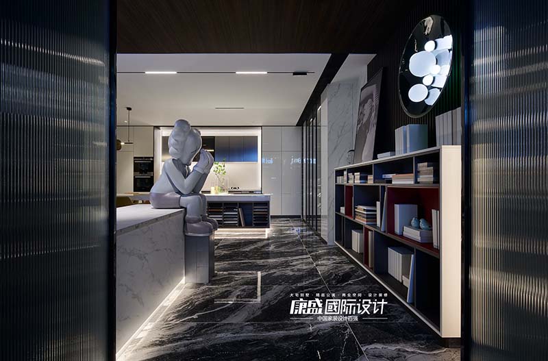 吧臺(tái)與書(shū)架相互呼應(yīng),二者形成一塊完整卻又獨(dú)立相呼應(yīng)的區(qū)域,兩者間的地面以大塊面的大理石磚分隔,自然流暢,簡(jiǎn)約大氣。