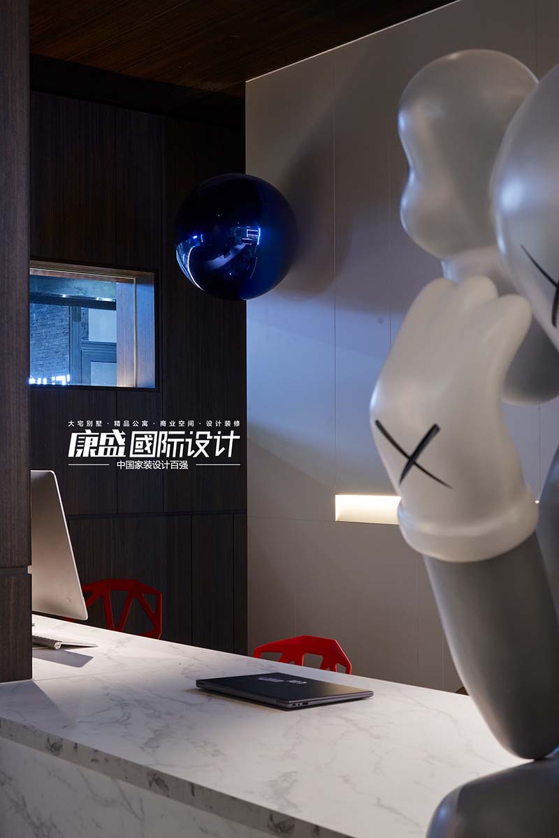 在前臺(tái)接待區(qū)域設(shè)計(jì)了吧臺(tái)和雕塑擺件的組合,作為進(jìn)入空間中第一印象的存在,設(shè)計(jì)師考慮更多的是其代表的形式感,以一種較為現(xiàn)代且充滿體量的形式自然出現(xiàn)。
