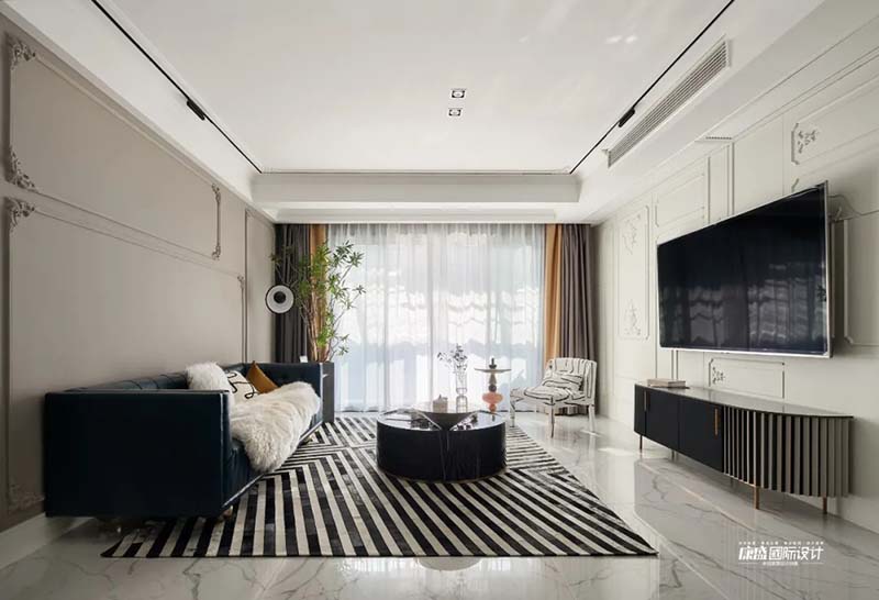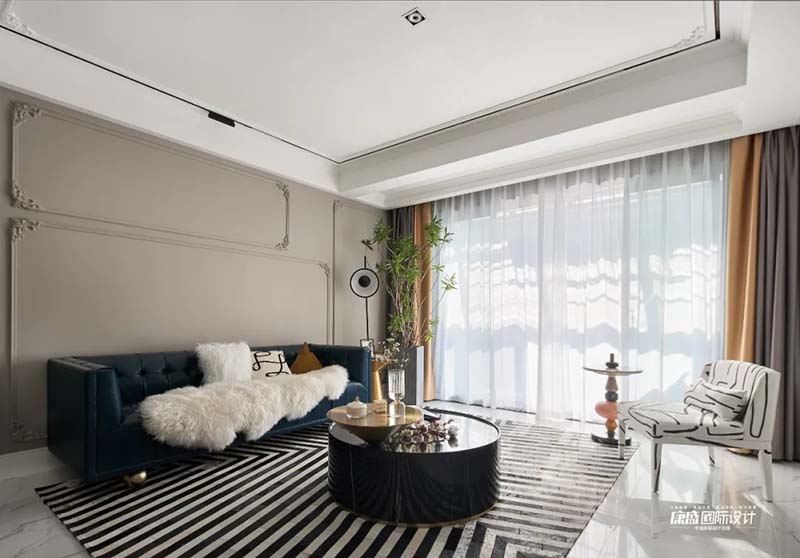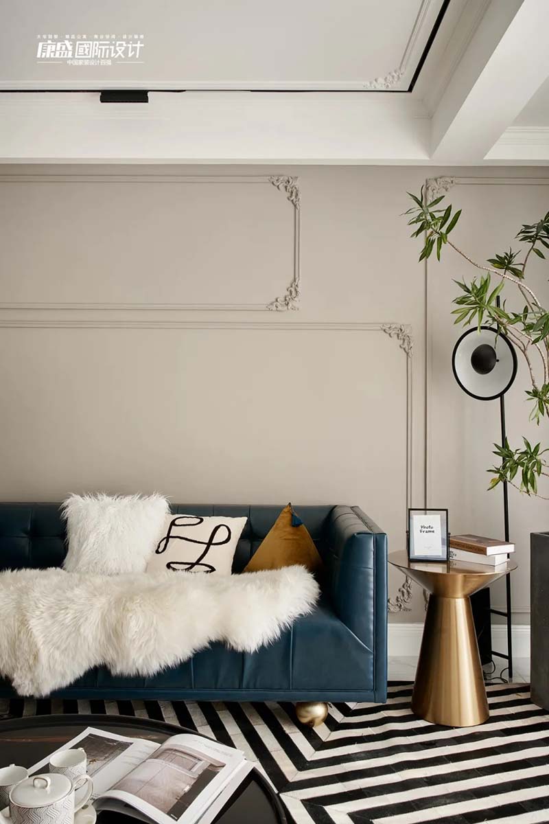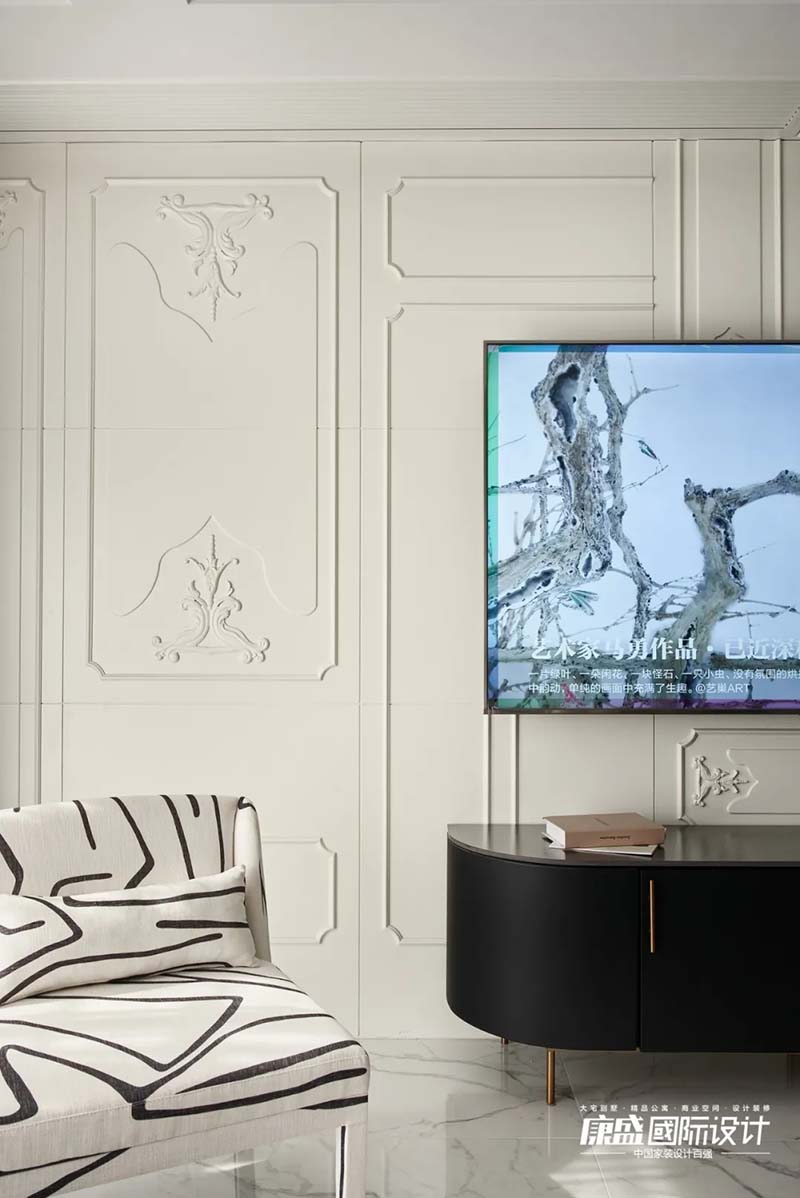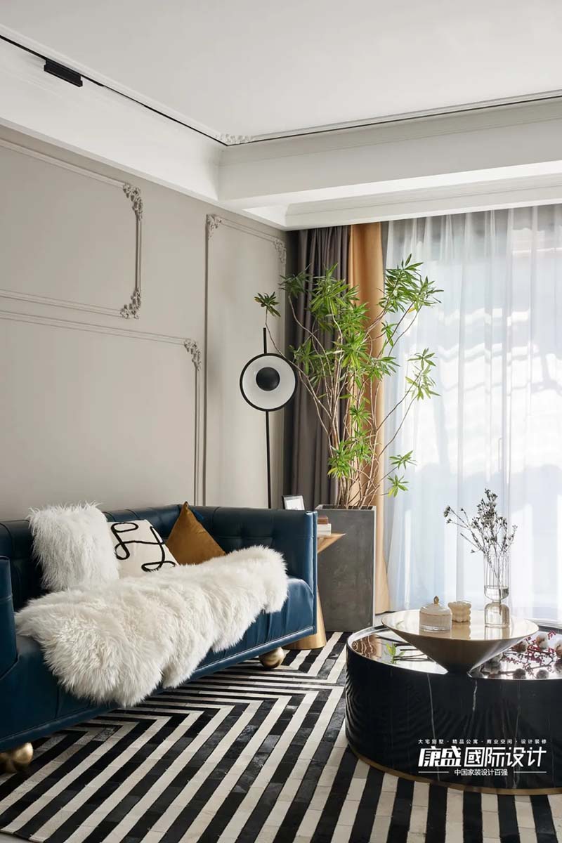 客廳整個(gè)空間明朗且清透,材質(zhì)的運(yùn)用細(xì)膩不張揚(yáng),以有限的空間與色彩的運(yùn)用,打造出空間的韻律感與多變性的體驗(yàn)。不規(guī)則定制墻板上浮雕的角花,用一筆安靜的藍(lán)色沉淀下整體素雅的基調(diào),透過窗滲入的暖陽,綠植投射下慵懶的姿態(tài),就這樣溫柔地把生活揉入了空間......