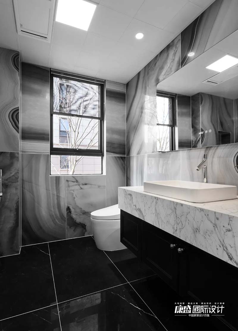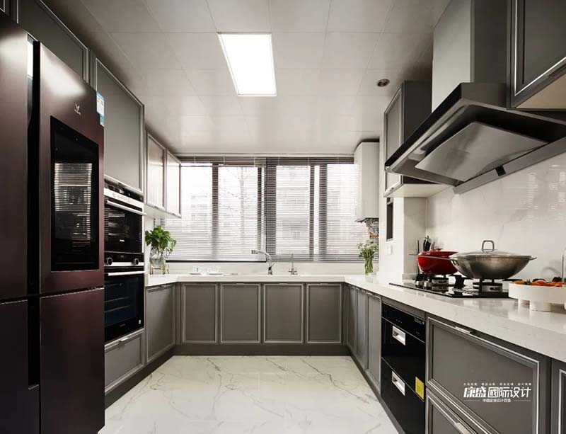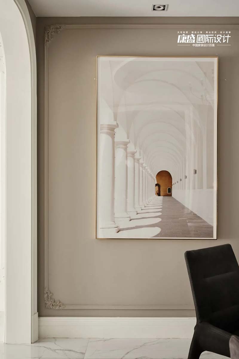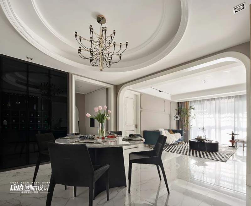 餐廳用對比和呼應(yīng)的方式呈現(xiàn)了材質(zhì)與色彩的關(guān)系,大理石餐桌臺(tái)面,帶有肌理感的麂皮餐椅。剛毅硬朗和柔軟細(xì)膩對比成型。圓形吊頂則呼應(yīng)了餐桌形體,輕盈的金屬吊燈,頂部環(huán)形燈帶補(bǔ)充的光線投射,讓家人同聚的餐飲時(shí)刻更加怡人。