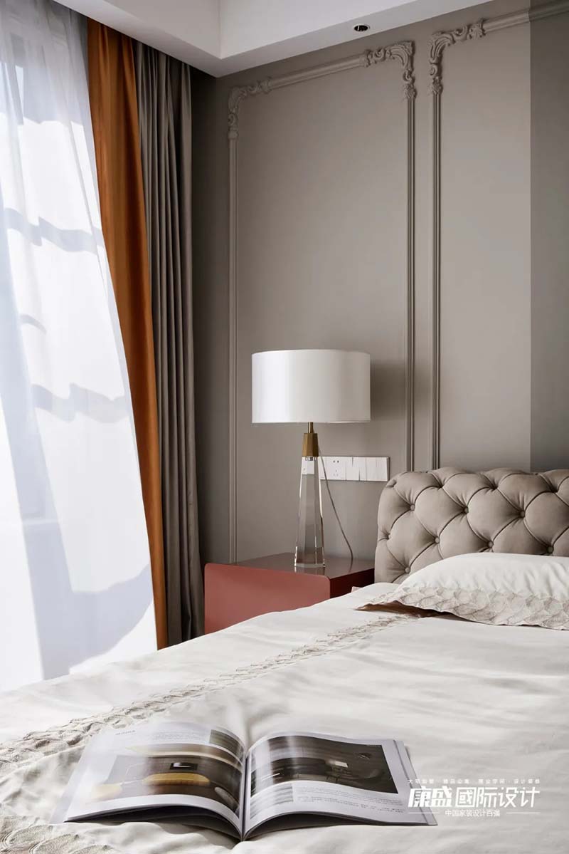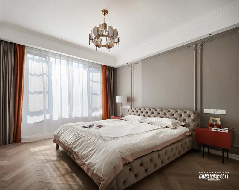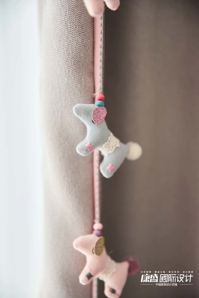 女孩兒房以粉色來調(diào)節(jié)整體淺灰色的主調(diào),背景定制墻布運(yùn)用幾何元素,跳躍空間層次的活潑,用異形的床品和細(xì)小的窗簾造型點(diǎn)綴來營造小俏皮風(fēng),將整個(gè)空間打造成小公主安靜爛漫的小小世界。