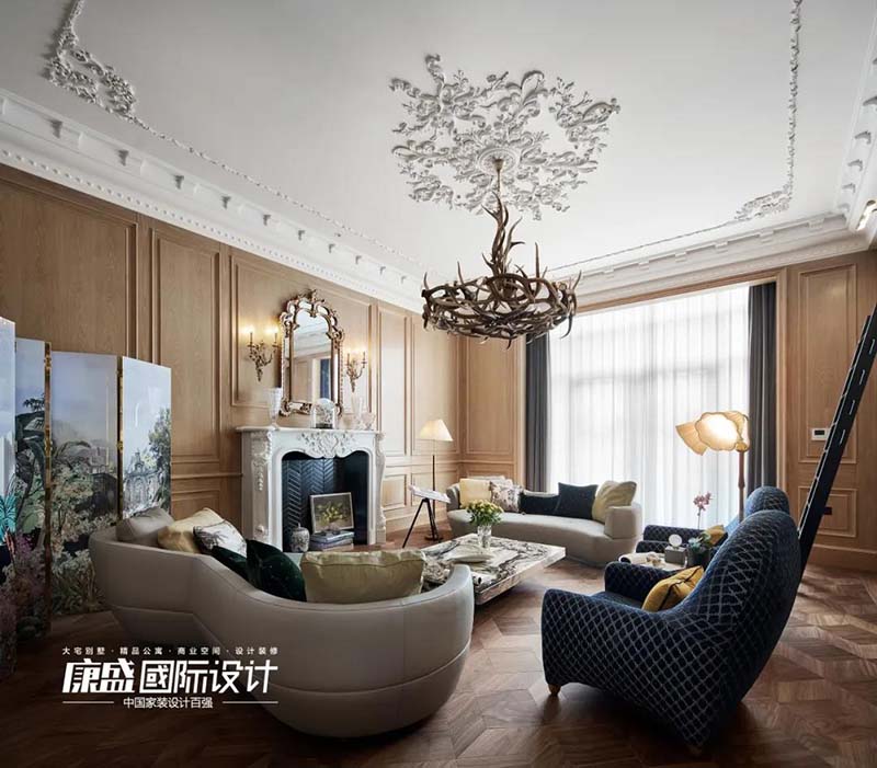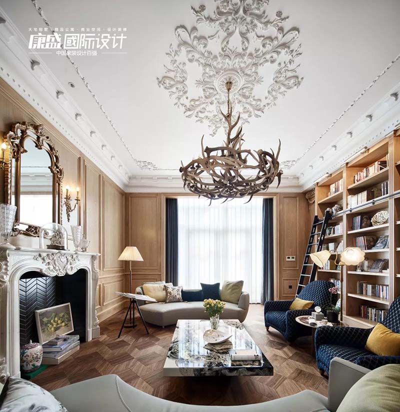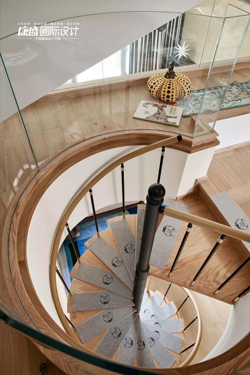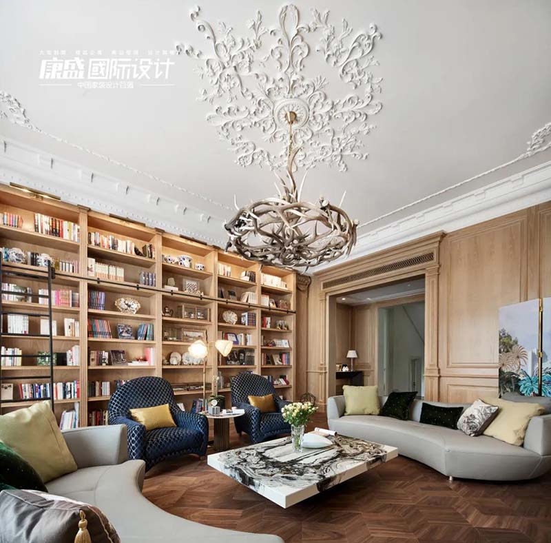 The height of the first floor is 4 meters. In order to maintain this height, we chose a part of the delicate resin parquet combined with PU lines, and used floor lamps and wall lamps for lighting.