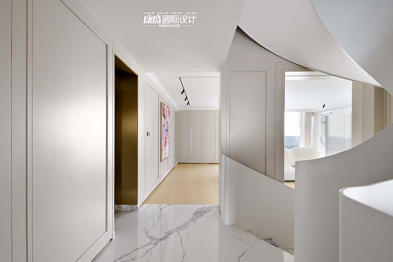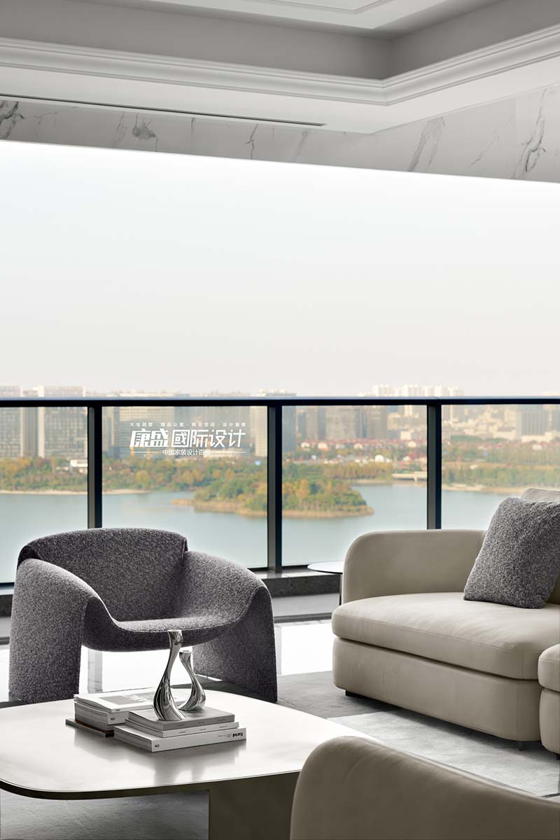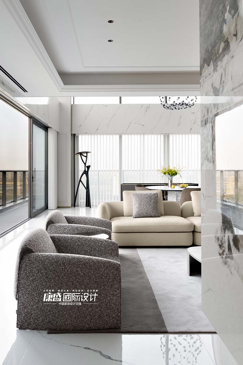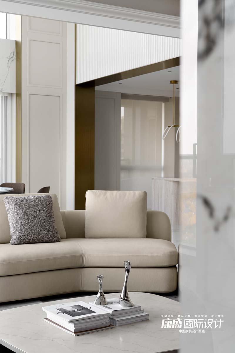 客廳區(qū)域低飽和度的色彩搭配呈現(xiàn)出一種溫潤質(zhì)感