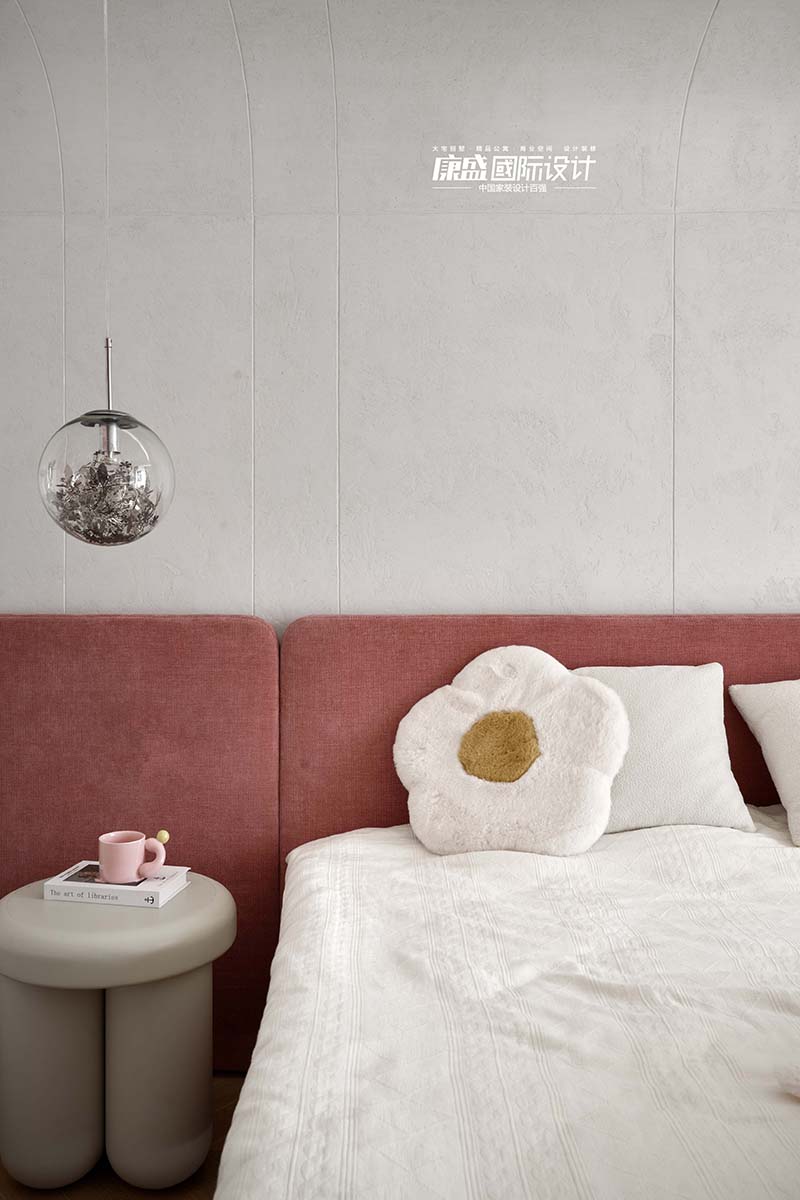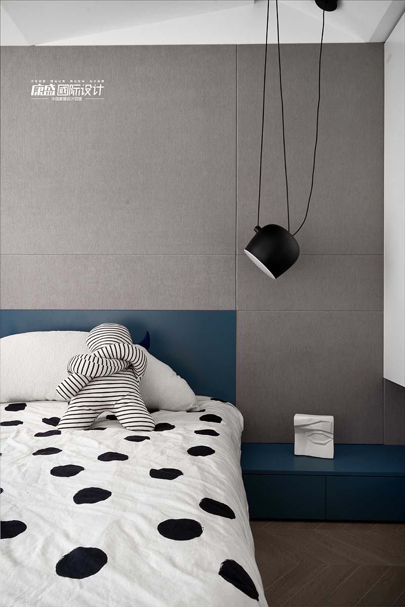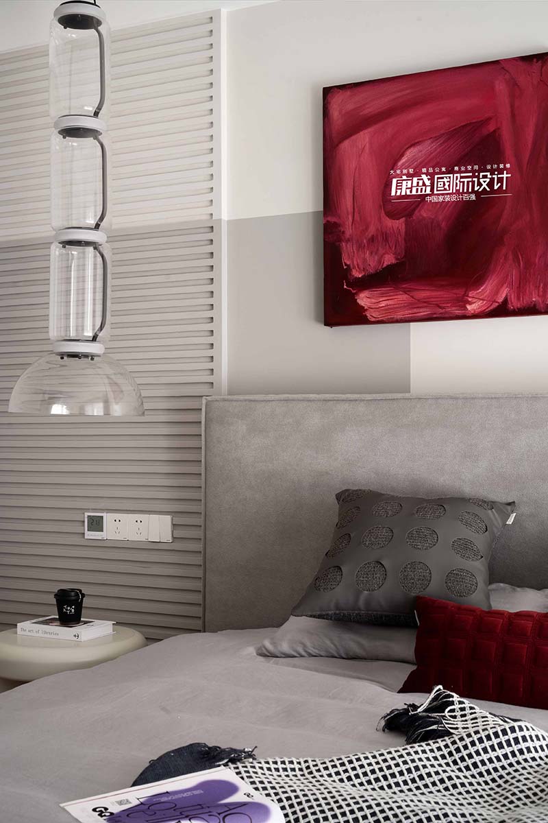 無主燈設計,玻璃的吊燈和灰色床頭格柵