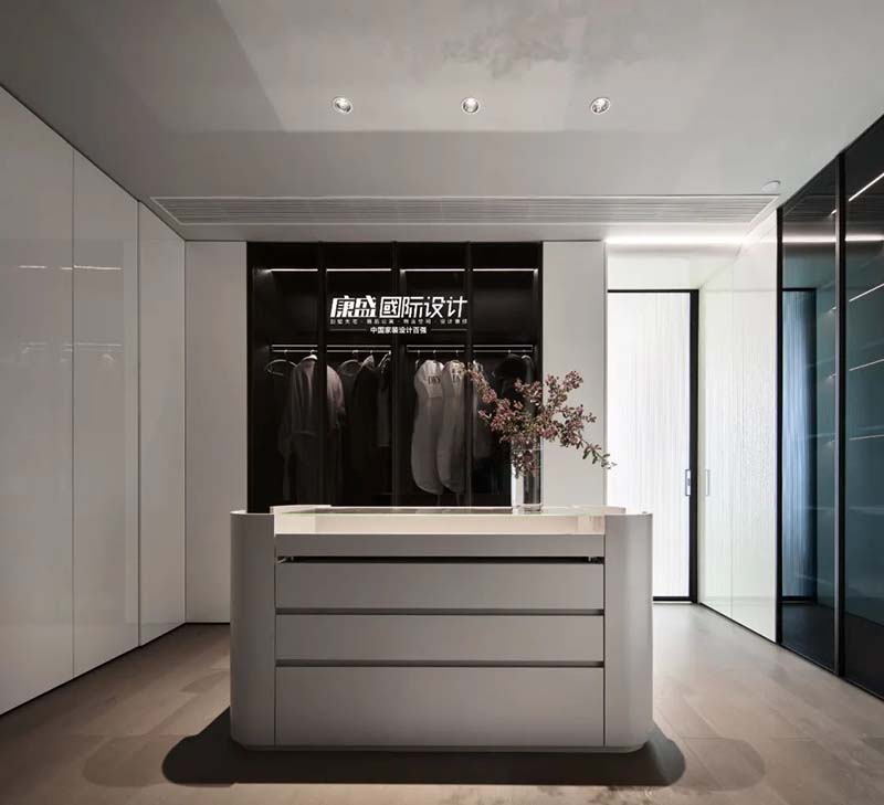 步入式衣帽間采用統(tǒng)一的色系,玻璃門(mén)+燈帶的設(shè)計(jì)滲透著高級(jí)感。