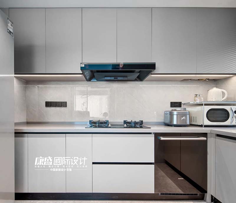 廚房通透明亮,灰白系廚柜將空間簡(jiǎn)化,觀(guān)感上舒適簡(jiǎn)潔,盡顯現(xiàn)代的質(zhì)感。
