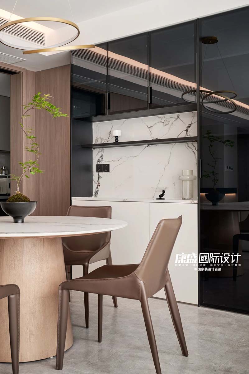 酒柜邊是一道暗藏式的玻璃移門(mén),里面布局了家庭儲(chǔ)藏空間。移門(mén)大部分時(shí)間打開(kāi)著,光影與每個(gè)區(qū)域互為一體,延伸了空間尺度。