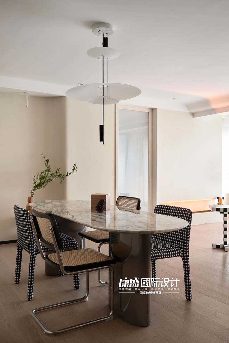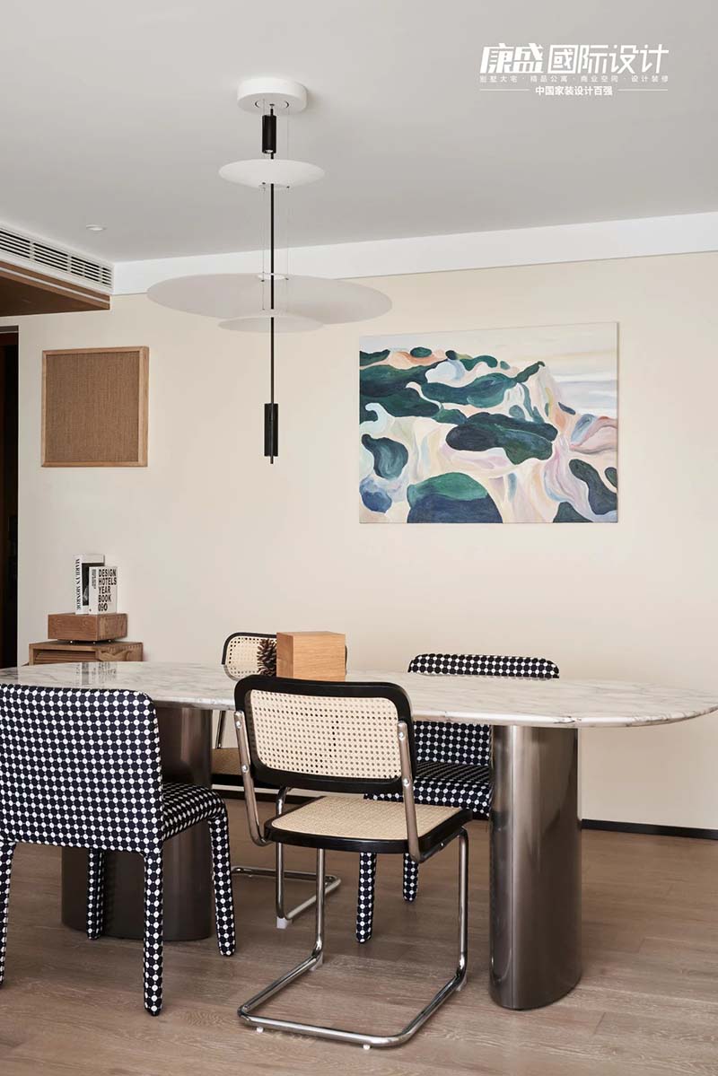圓弧形的餐桌使得空間沒(méi)有分割感,一盞吊燈營(yíng)造的氛圍,家人圍坐一起,最美的煙火,就是家里的飯菜香。