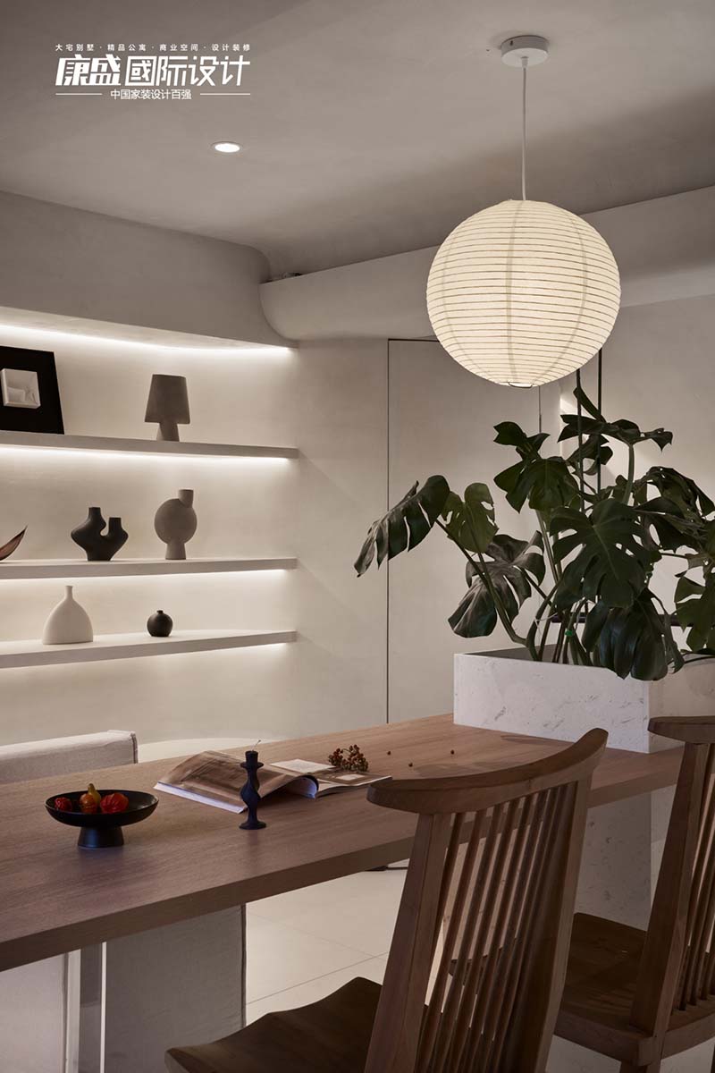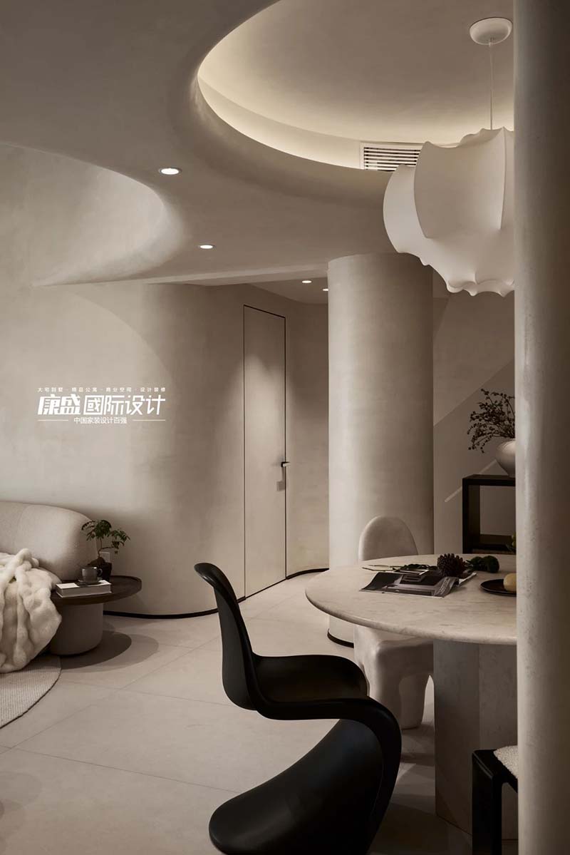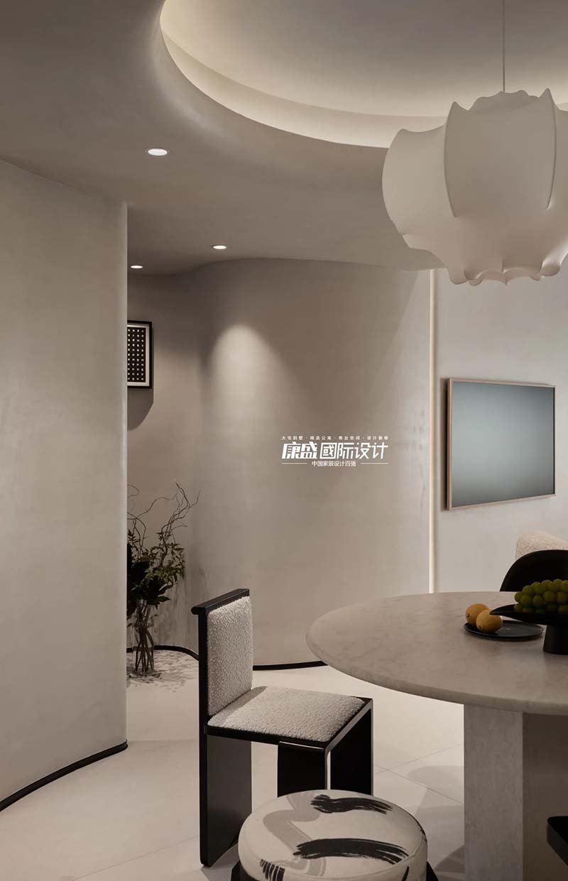 圓形餐桌呼應(yīng)吊頂形狀,形成空間整體感。