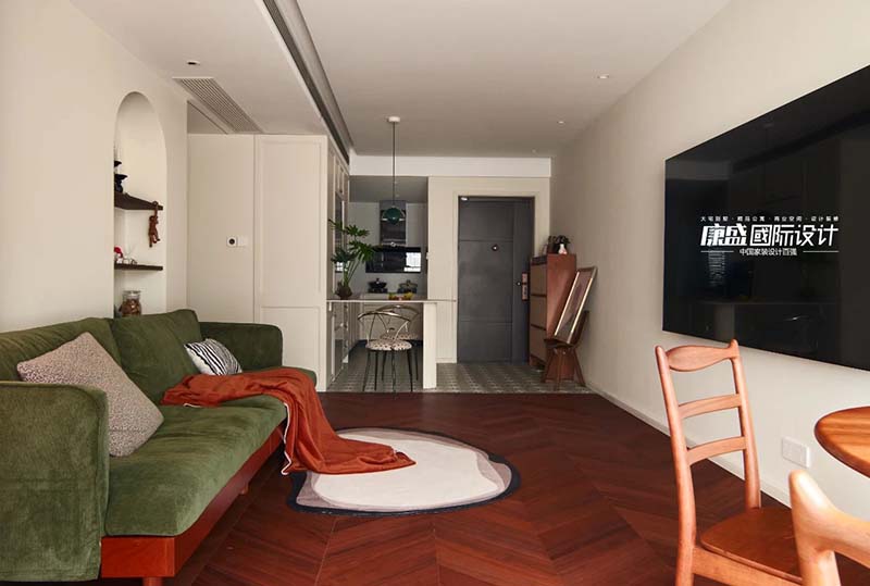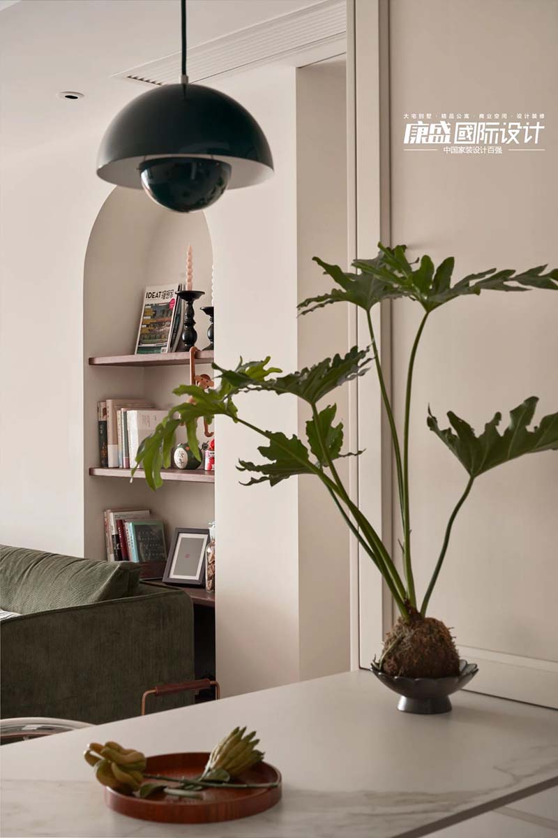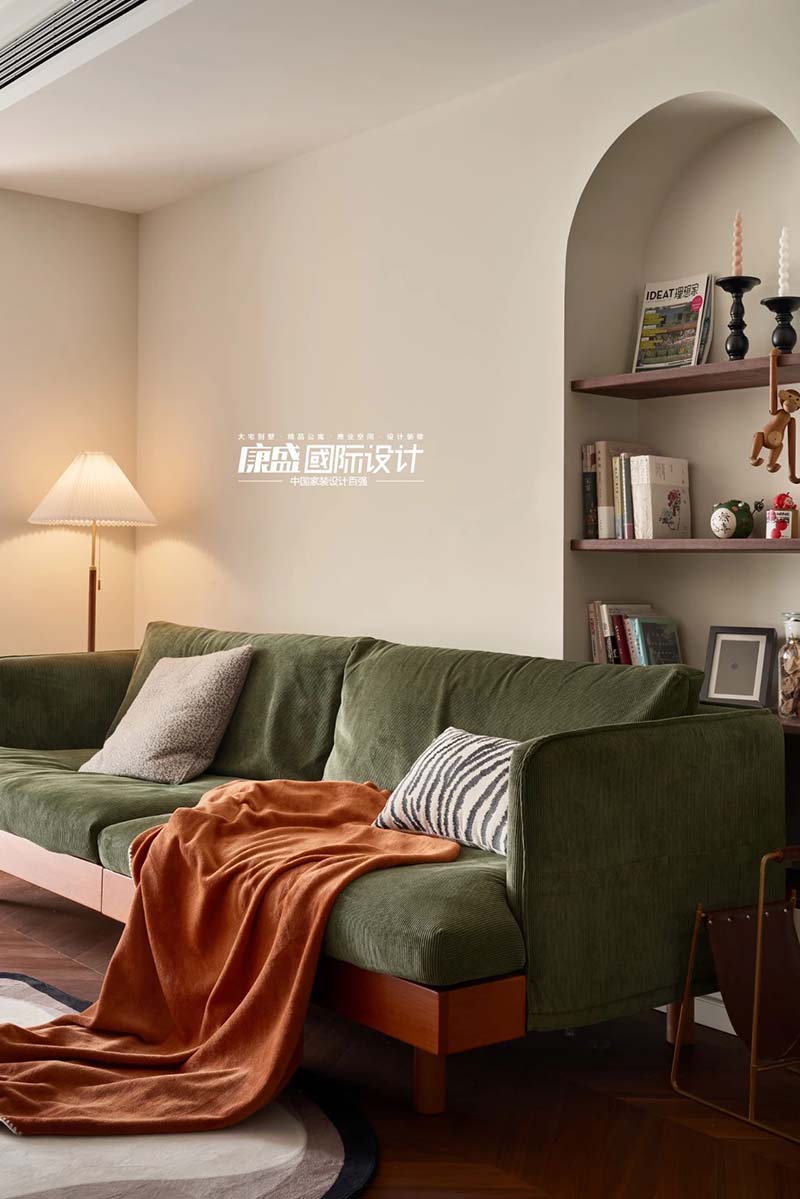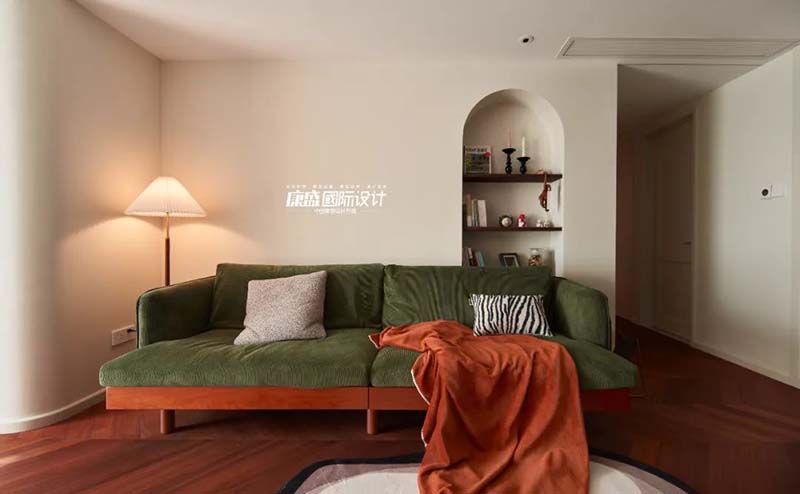 擺放的復(fù)古綠沙發(fā)配上拱形的開放式收納柜,