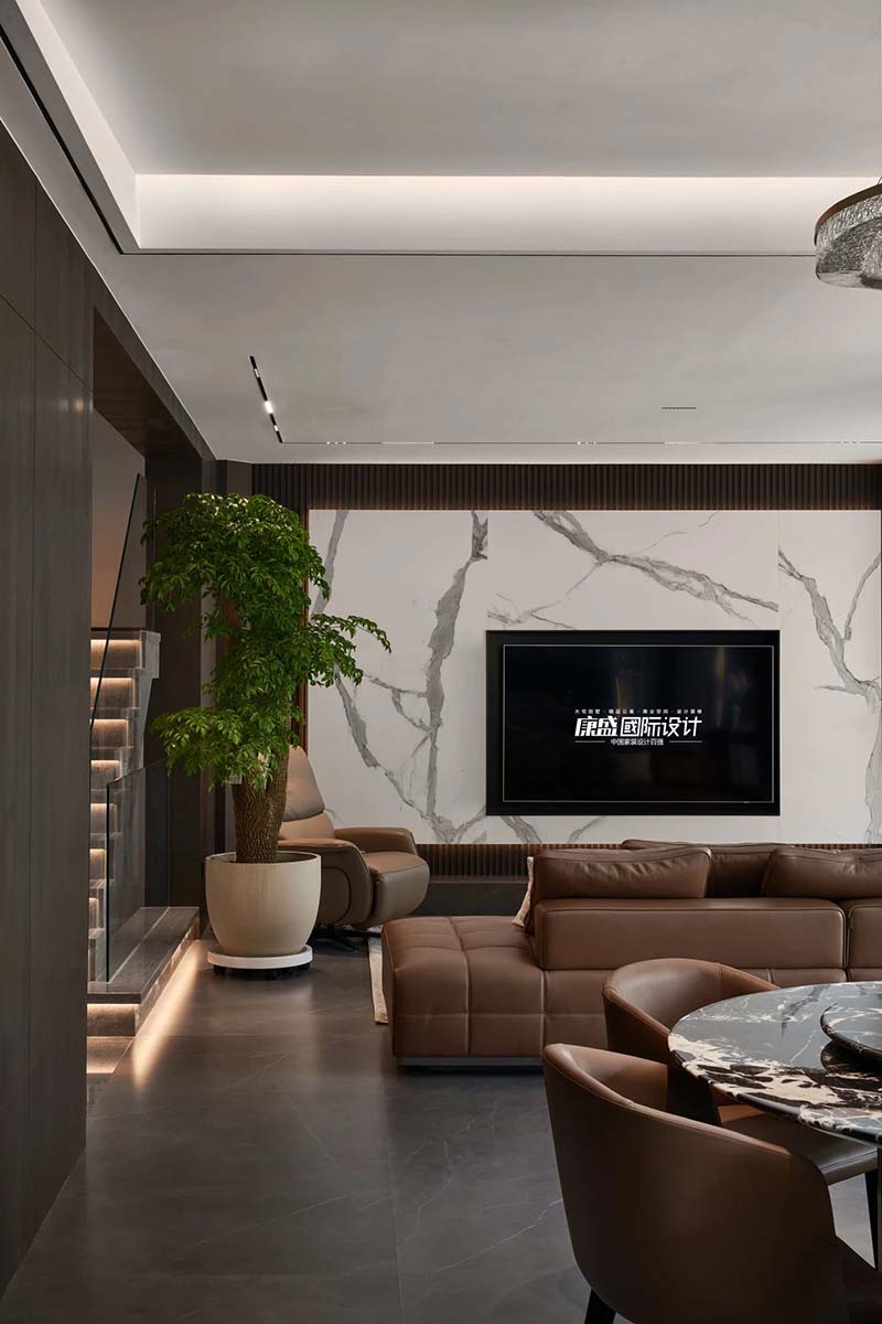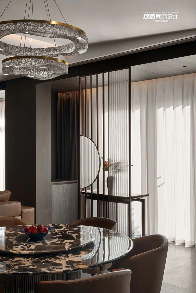 新中式的點睛之處在于化繁為簡,去除傳統(tǒng)中式繁復(fù)的花紋樣式,只保留些許具有代表性的線條樣式,極為簡練,克制,融合了莊重與優(yōu)雅雙重氣質(zhì),釋放了空間,運用肌理感強的大理石與木材結(jié)合,讓新中式風(fēng)格富有歷史氣息。