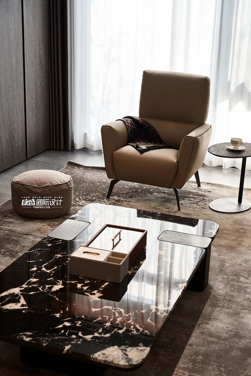 新中式東方意境,一種回歸自然的舒適美感。深色大理石通鋪與墻面的相互協(xié)調(diào),紗簾柔和了強烈的光線,讓顏色和溫度都停留在剛好的位置。