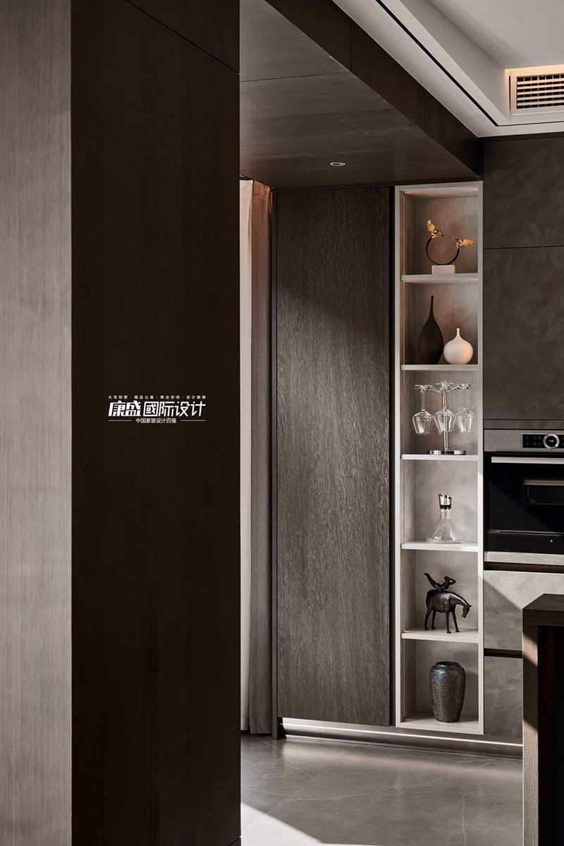U型中廚布局設(shè)計,以深灰色與白色為主色,灰白的對照,營造出干凈、明亮的氛圍,并與現(xiàn)代風(fēng)格的家居裝飾相協(xié)調(diào)的同時,為廚房空間增添一份優(yōu)雅。