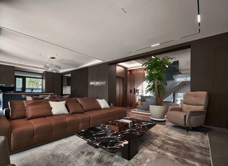 The overall color scheme is mainly black, white, and brown, with a maximum proportion of about 60% in off white. This leaves a visual space for indoor matching, making the space more transparent. On the basis of bright white tones, 30% black is integrated to enhance the high-end texture, and finally, 10% brown is retained to enhance the gentle temperament and warm attribute.