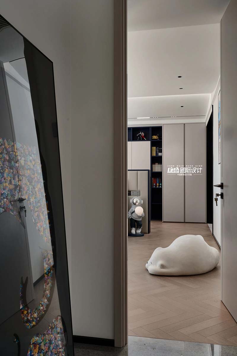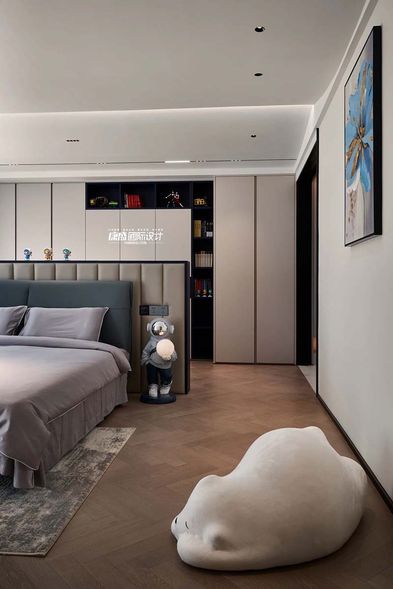 低飽和度的色彩運用,趨于簡潔和清爽的高級感兒童房設(shè)計。床頭背景墻用半墻隔斷代替,分割出休息區(qū)和學(xué)習(xí)區(qū),靠墻打造正面墻的衣柜,有藏有露,衣物一目了然。