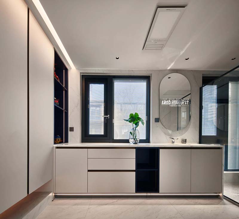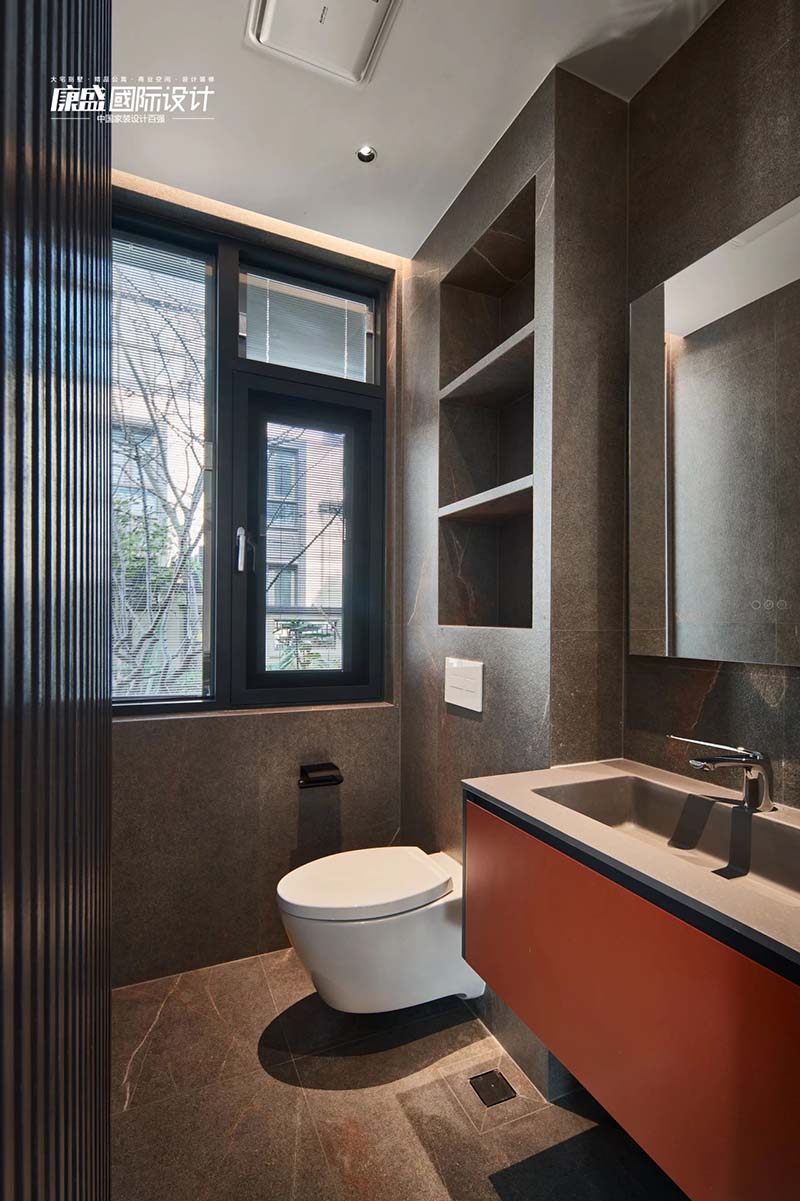 Low saturation marble tiles are used to create a tasteful and introverted space, with a dual separation design that effectively separates dry and wet areas.