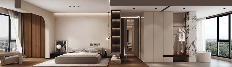 The bedroom balcony is integrated, and the soft arched door design allows life and art to coexist. The overall white color scheme creates a clean and minimalist sleeping environment, complemented by artistic chandeliers that add warmth and depth.