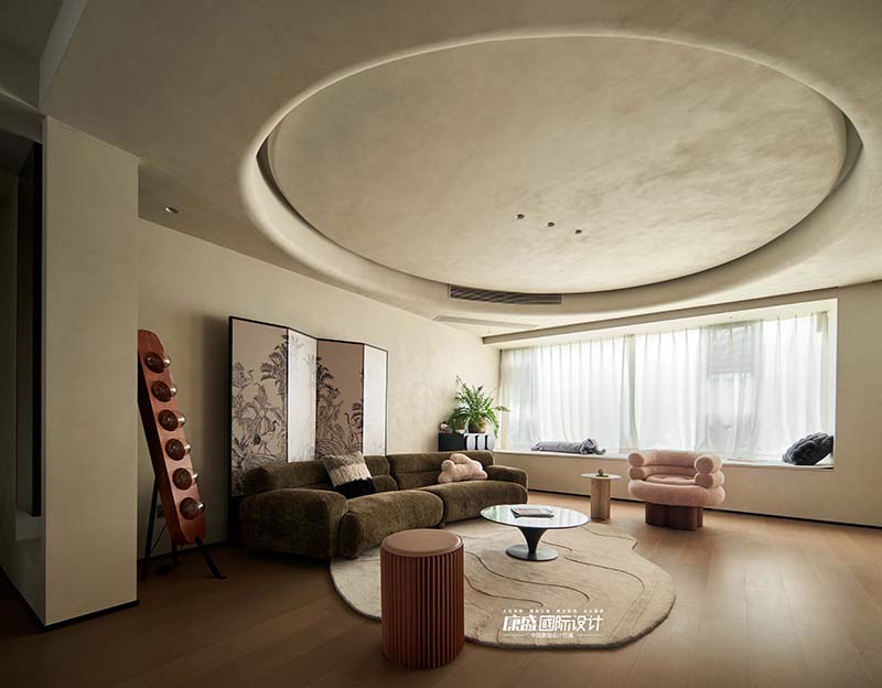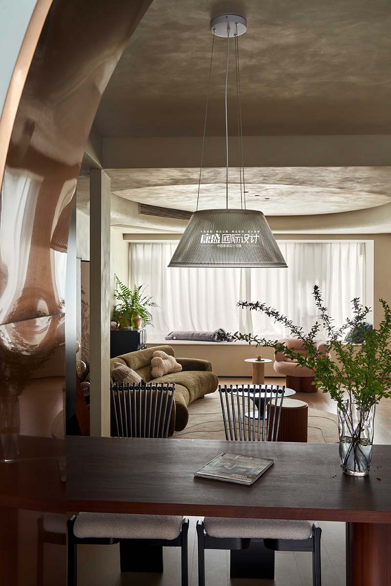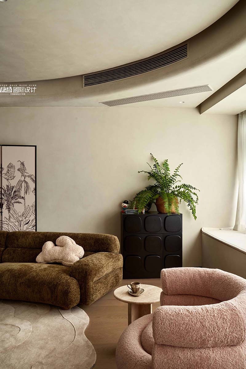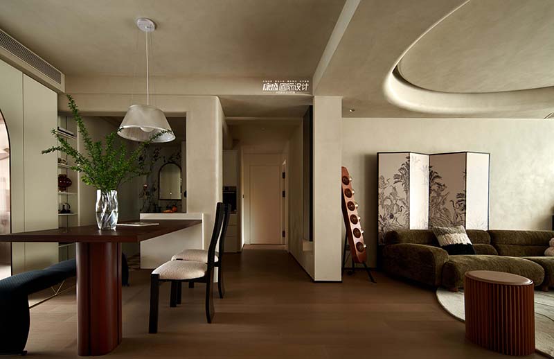 全屋采用奶油白為背景色,奠定浪漫基調(diào),配上胡桃色家具,增添復(fù)古氣息,經(jīng)典的弧形門洞、圓形吊頂以及浪漫的中古燈飾,于克制之中將中古風(fēng)的沉穩(wěn)大氣細(xì)膩的傳遞出來(lái)。