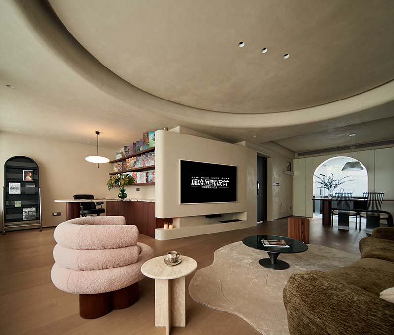 The whole house adopts cream white as the background color, setting a romantic tone, paired with walnut furniture, adding a retro atmosphere. The classic curved door opening, circular ceiling, and romantic medieval lighting convey the calm, atmospheric, and delicate charm of the medieval style in restraint.