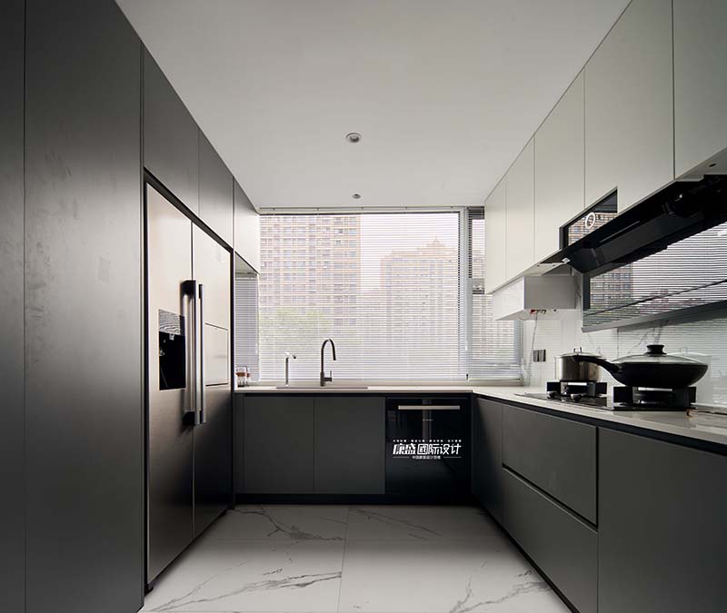 On one side of the restaurant, the space of the western kitchen extends. The selection of walls, cabinets, and stone shelves are all light colors that are consistent with the overall color tone, making the overall space atmosphere more harmonious. In home soft furnishings, some green plants, small ornaments and other elements are added to add vitality to the space.