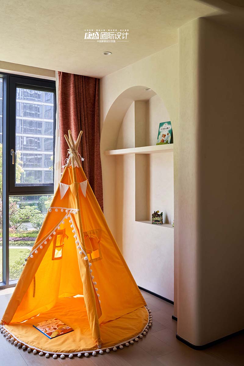 The bedroom is designed with a light color scheme as the base, and the suspended ceiling is designed with circular arcs to weaken the obtuse angle of the crossbeam. The soft furnishings in the study area use a variety of bright color combinations, with warm and soft milky white as the base color, creating a visual impact of "dynamic and static combination" for home decor.