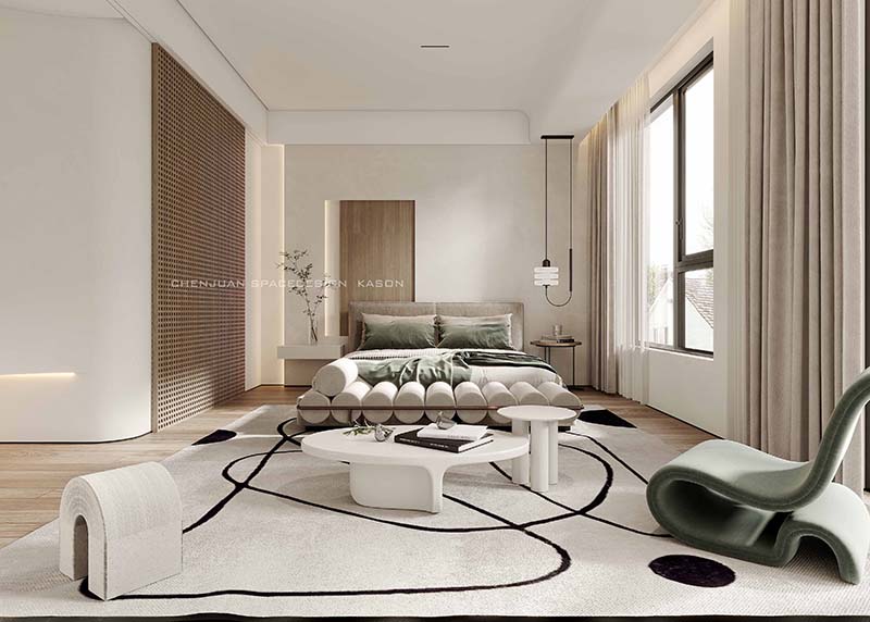 The color scheme of the master bedroom is mainly minimalist and clean, with a wooden space that makes people feel comfortable and relaxed. The just right touch of black in the space is like the finishing touch of a dragon painting, forming a sharp contrast with the overall atmosphere. The collision of these two creates a unique chemical reaction that complements each other, creating a comfortable and tasteful living space.